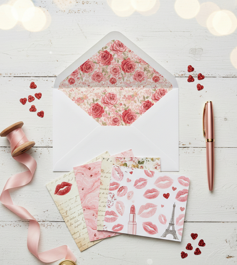 - The Build: Use your digital papers to print double-sided A7 note cards. Pair them with envelopes lined with your Red Glitter Heart patterns.