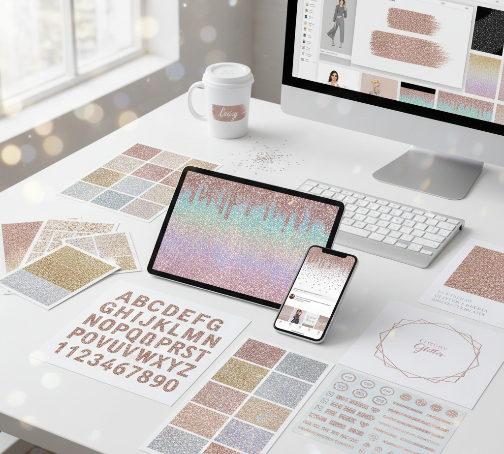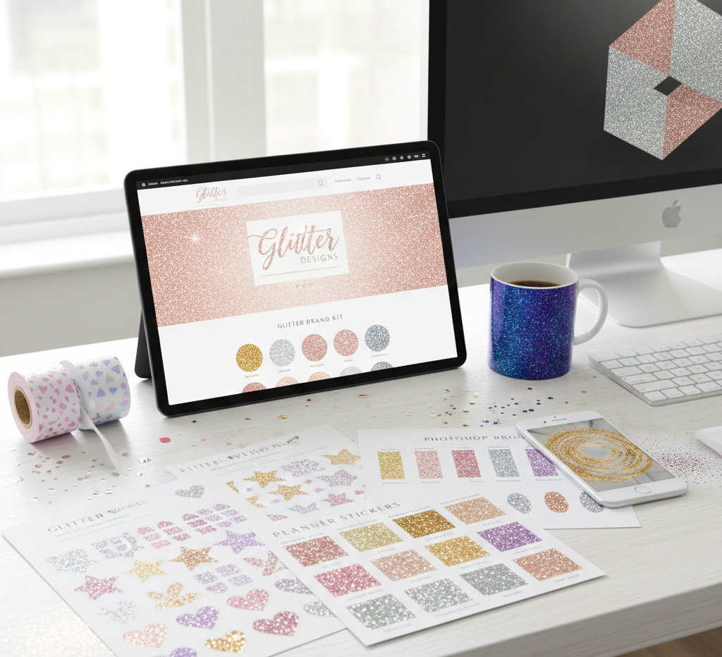 6 projects where the glitter stays on the screen, used for professional branding and digital products.