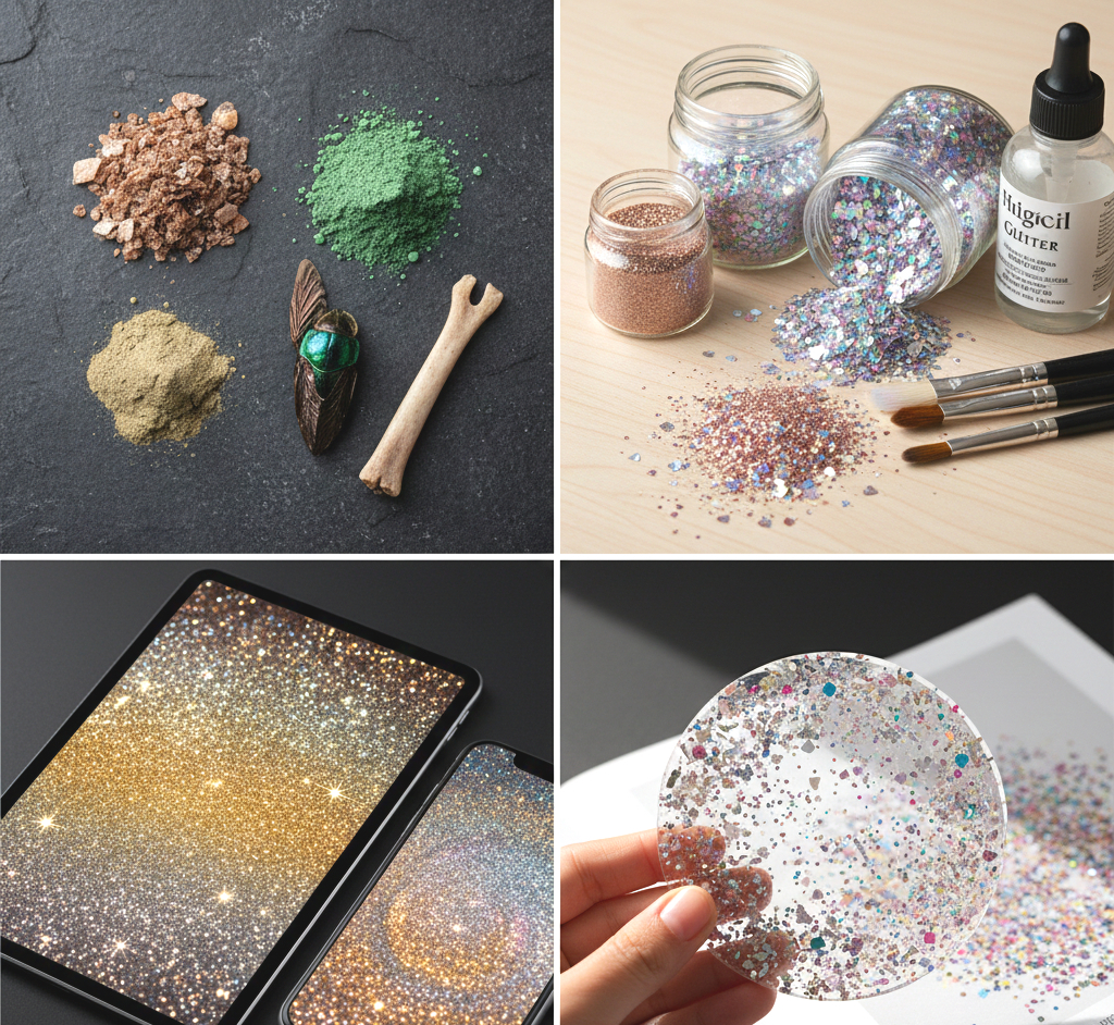 Physical glitter is the "soul" of the shimmer synthesis. From prehistoric cave paintings adorned with crushed mica to the high-tech polyester films used in modern auto paint, humans have always sought to capture light in their hands. In the world of physical crafting, choosing the right material is as much about science as it is about style. Polyester (PET) glitters are the gold standard for crafters today, prized for their ability to withstand the high heat of heat presses and the harsh chemicals of epoxy resins without losing their prismatic finish. Beyond just the color, the "cut" of the glitter defines the project's vibe: ultra-fine powders create a sophisticated, silk-like glow perfect for wedding stationery, while chunky hexagonal mixes provide the structural "crunch" and 3D depth needed for statement resin trays or festival makeup.