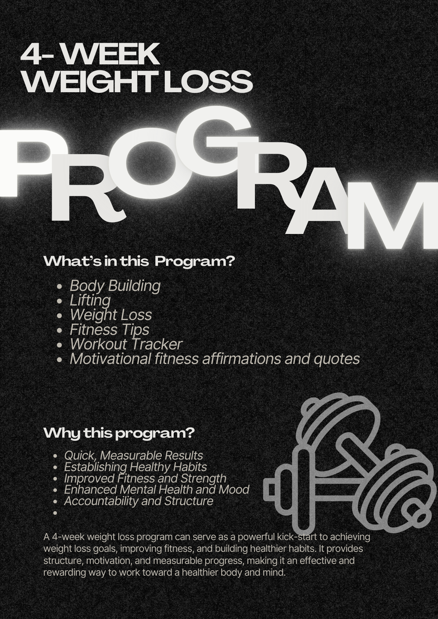 This 4-week weight loss program can serve as a powerful kick-start to achieving weight loss goals, improving fitness, and building healthier habits. It provides structure, motivation, and measurable progress, making it an effective and rewarding way to work toward a healthier body and mind.