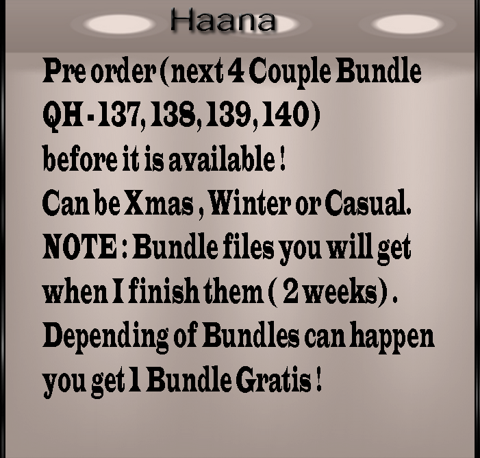 Welcome & Hi ! Haana and QHN files " Fall , Winter , Spring, Couple Bundles , Freebies Files , Project Files Generator ( FULLY LAYERED/GROUPED/LABELED PSD Format ), Skins, Makeup ..." .Please send me message on which account you will use files. If you have any questions or you intersested for fully PSD " Project File " for some files please send me message ! RR Ahimani , Fleshed , DarkDevil, Mole. I do custom and price depends on what you want and do you want only for your shop or etc. Message me on Haana IMVU account what you want and I will tell you price ! Note : Once are limited files are SOLD OUT they will not be reopen for more people. Thanks