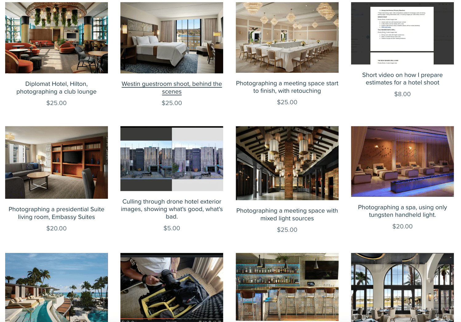In the videos below, I show my entire workflow when shooting various hotel spaces, lifestyle with models and food photography.