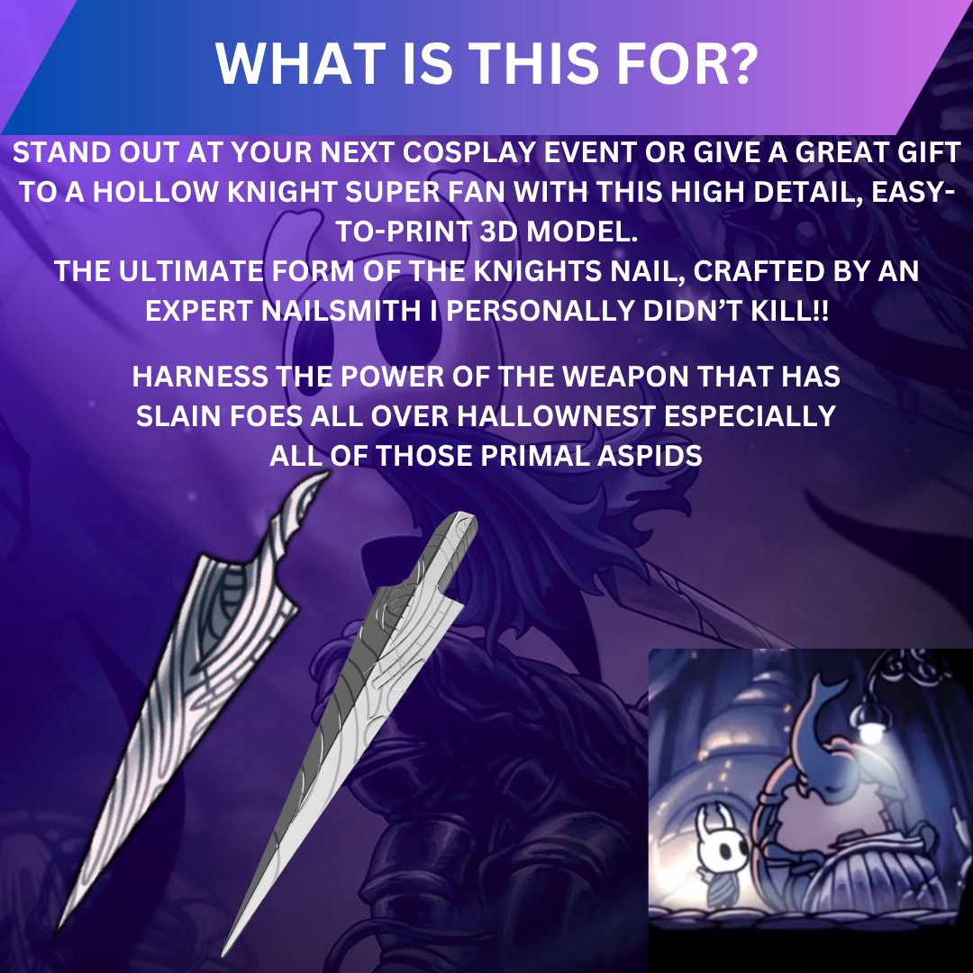 Bring the world of Hollow Knight to life with this detailed 3D model of the Pure Nail, the ultimate weapon wielded by the Knight! Known for its iconic, sleek, powerful design.