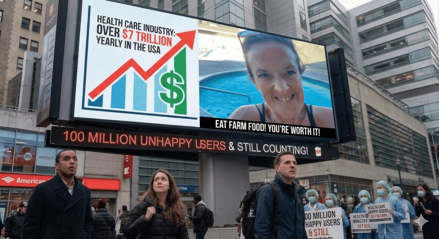 I created an image that says what most people are too afraid to say out loud. A massive billboard: “Health Care Industry: Over $7 Trillion Yearly in the USA.” Right beneath it: “100 Million Unhappy Users… and still counting.” And next to all of that...