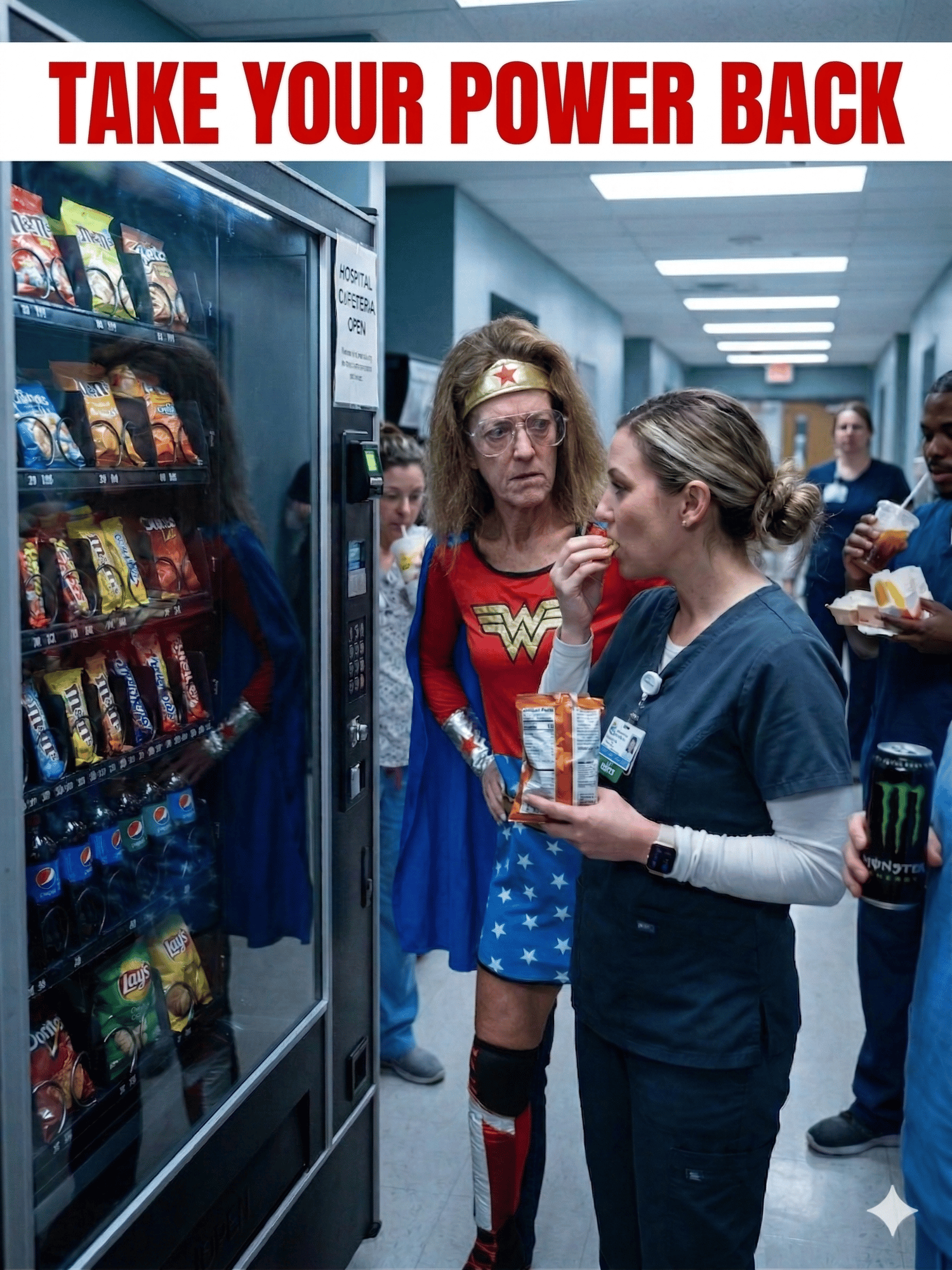 Do you know what boils my blood? Hospitals with vending machines. Fast food right outside the door. Doctors. Nurses. Staff— snacking on chips, drinking soda, energy drinks… Right in front of you. So let me ask you— Why would they tell you not to eat...