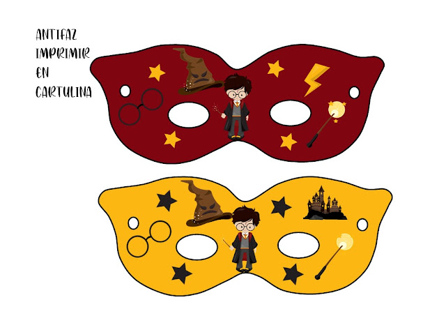 Los antifaces los podéis utilizar, o bien poniendo gomitas en los laterales, o bien pegando un palito y hacerlo tipo photocall. La impresión es mejor realizarla en cualquiera de los dos casos en cartulina, para que quede más rígido.