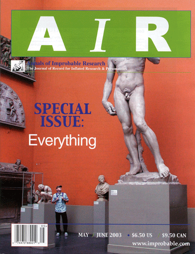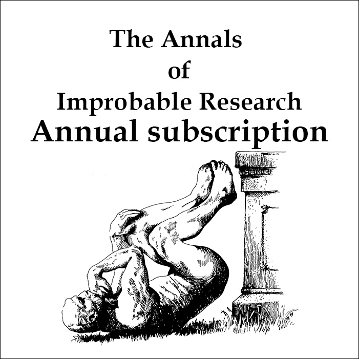 Real research, about anything and everything, from everywhere — research that’s maybe good or bad, important or trivial, valuable or worthless. Compiled for you, by the producers of the Ig Nobel Prize ceremony. Six (6) new Improbable magazine issues every year!