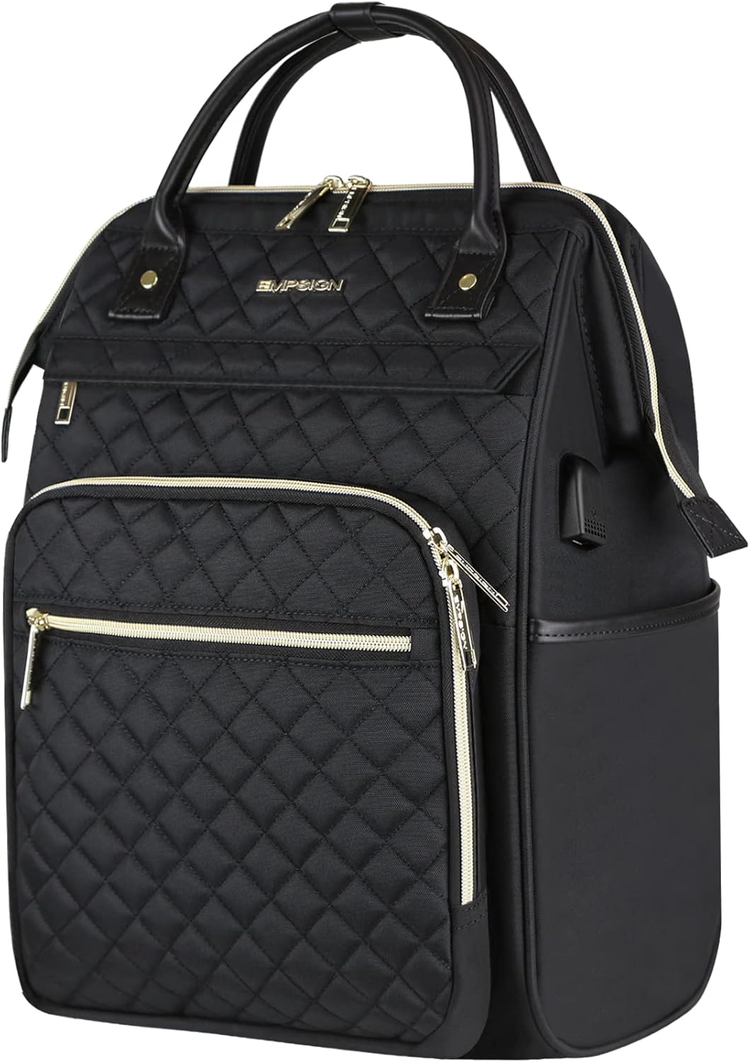 This stylish backpack opens wide and holds up to a 17-inch laptop with room to spare, has a water-repellent quilted exterior for rainy commutes, and features a built-in USB port for easy charging on the go.