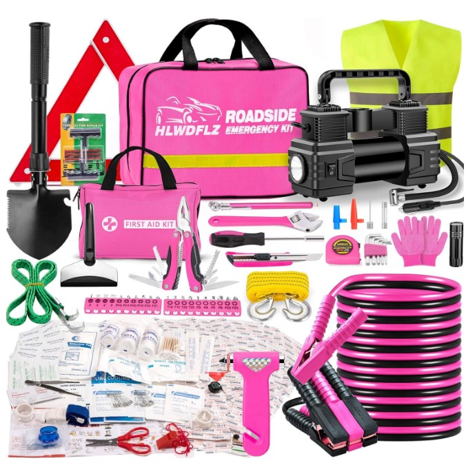 Stay safe and stylish on the road! This Pink Car Emergency Kit has everything you need — from a portable air compressor to winter travel essentials. Safety never looked so good! #RoadReady #EmergencyKit