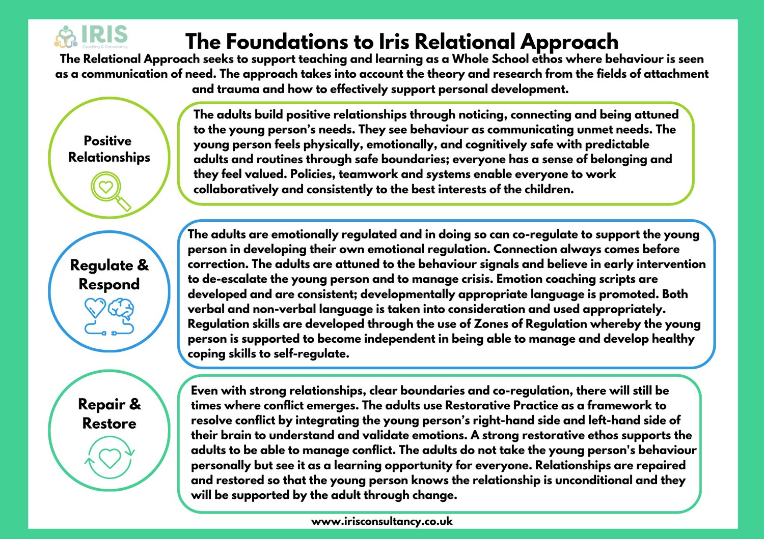 The guidance and audit are based on theory, research and evidence, collaborated and created through Iris Consultancy to influence whole school systems as well as embed everyday teaching practice and targeted support. It seeks to support schools to implement and embed Relational Behaviour policies and systems which incorporate the whole school community; from pupils and parents/carers to staff and governors. The audit and guidance has been written in response to current research and concerns in support of building and developing children’s SEMH needs through the Relational Approach. The guidance and audit builds on the foundations which schools have prioritised from the fields of attachment and trauma. Iris Consultancy are committed to increasing inclusion for children with SEMH needs whilst reducing the rate of exclusion of children from these vulnerable groups.