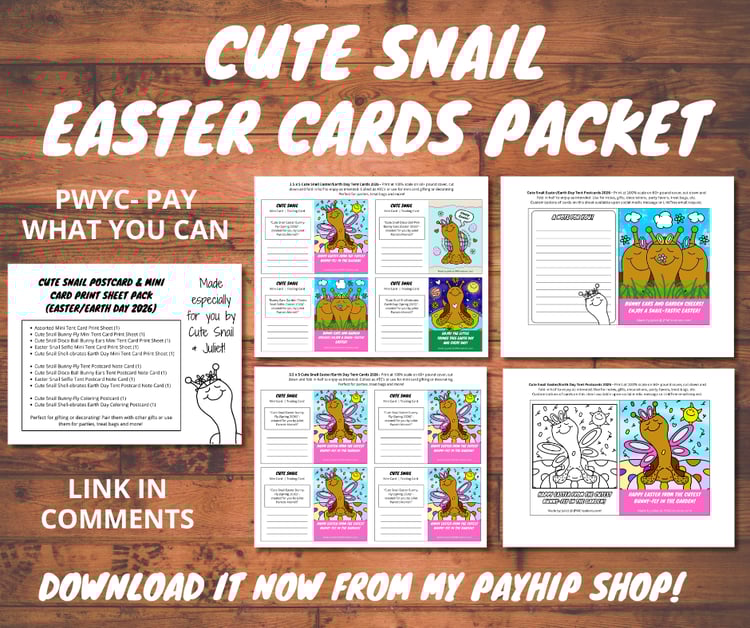 Welcome to an exciting new way for those who know and love Cute Snail and me to access and support our work. All of our SNAIL-TASTIC signature mini cards, coloring pages, coloring books and more together all in one place. Pay What You Want (PWYW) in any amount - even if it’s $0!