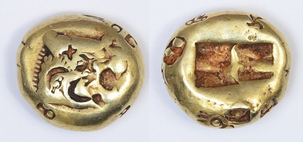 The first coins we know of were made in Sardis, Western Asia, in the seventh century BC. They reached Greece within a hundred years, but were not used to buy or sell things at that time. Those coins were more like medals than modern money; stamped with the logos of aristocratic families, and given as gifts to secure alliances. Coins did not, as the neoliberals claim, evolve out of barter; they evolved out of a desire to maintain power.