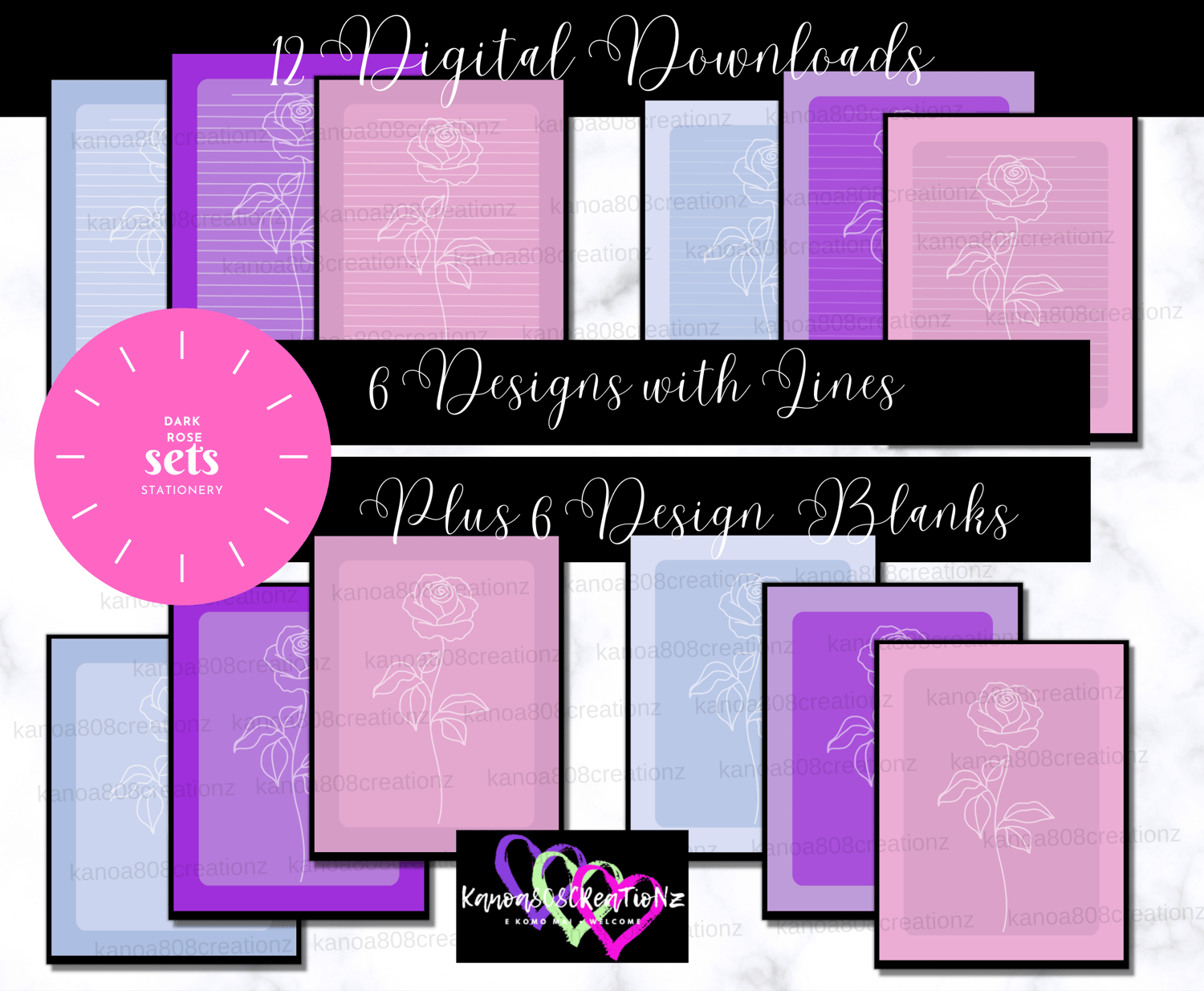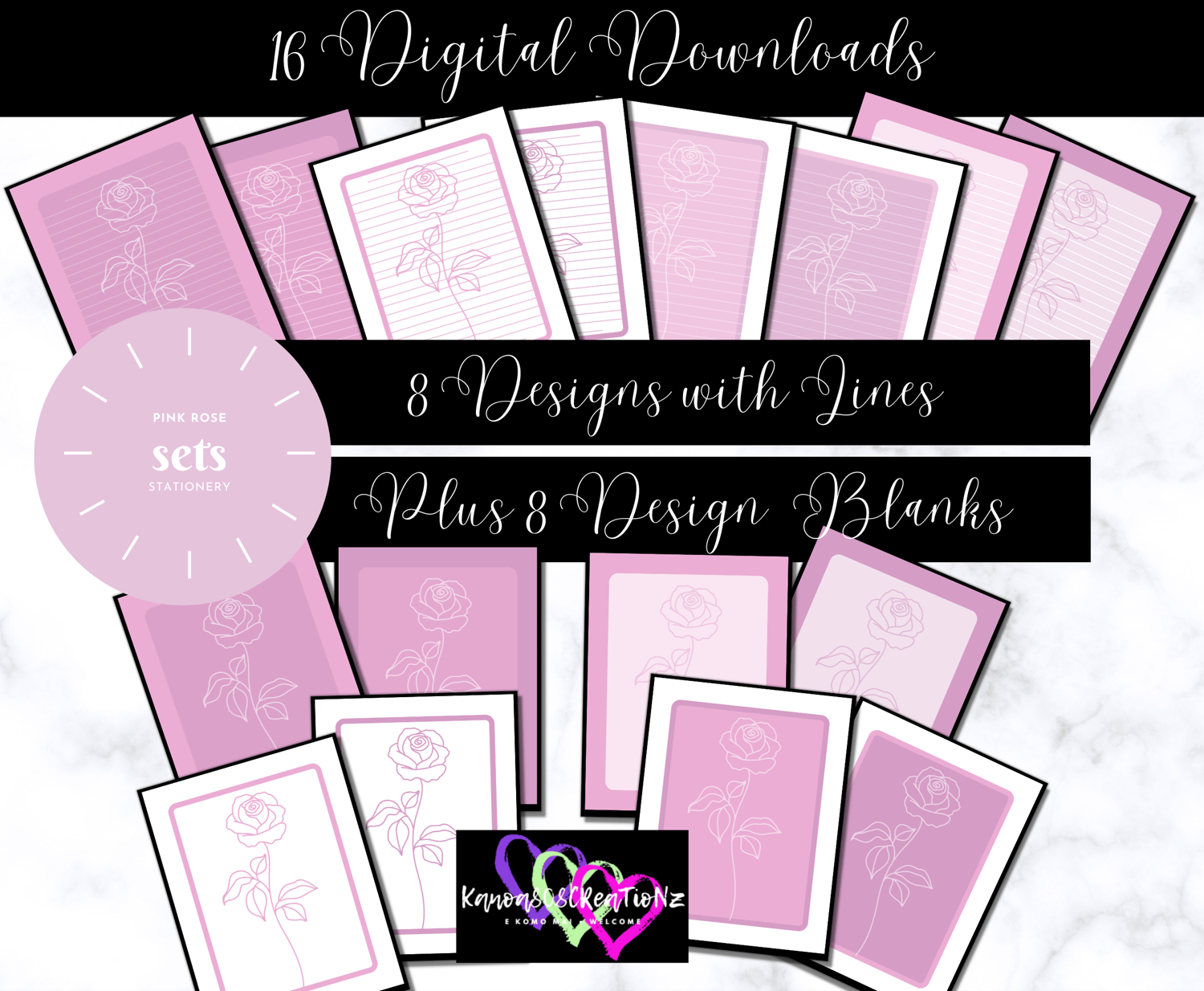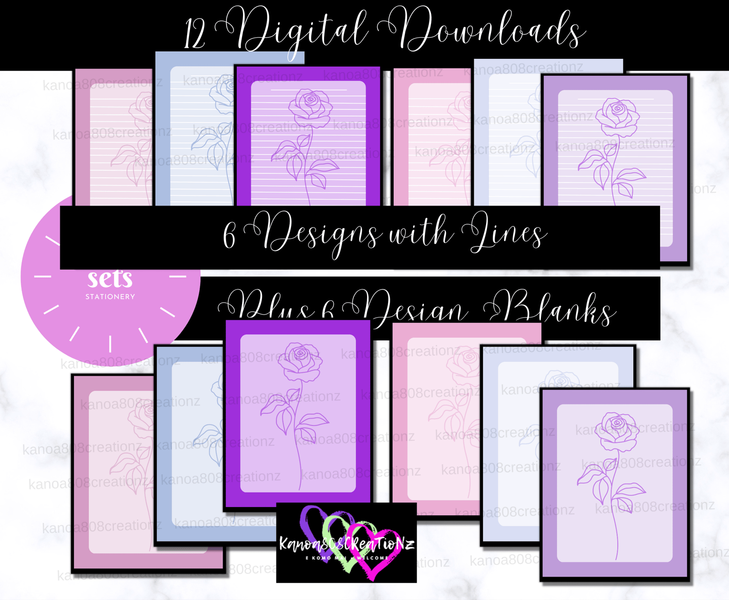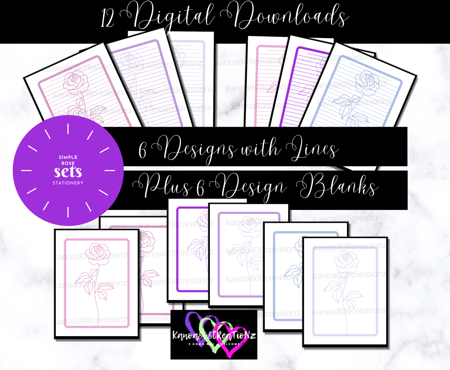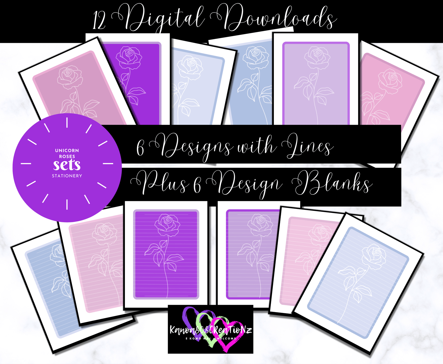 12 Digital Downloadable & Printable Files: Unicorn Colors Simple Rose Stationery Set