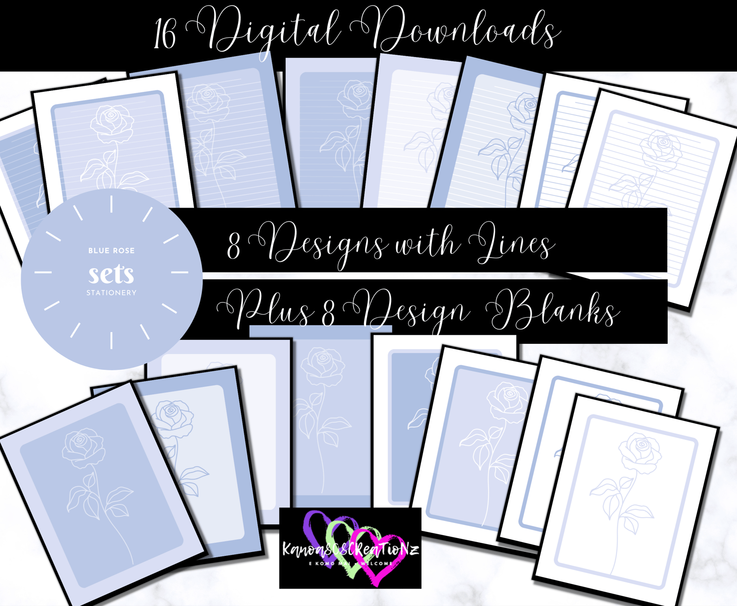 16 Digital Downloadable & Printable Files: Blue Roses Stationery Set
