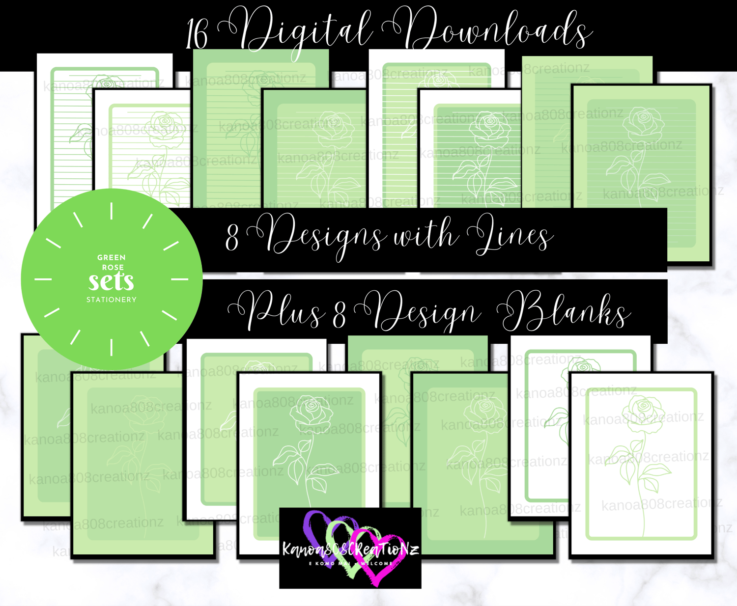 16 Digital Downloadable & Printable FIles: Green Roses Stationery Set