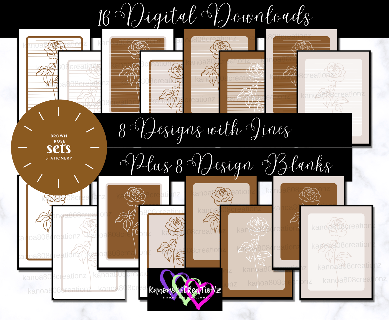16 Digital Downloadable & Printable FIles: Brown Roses Stationery Set