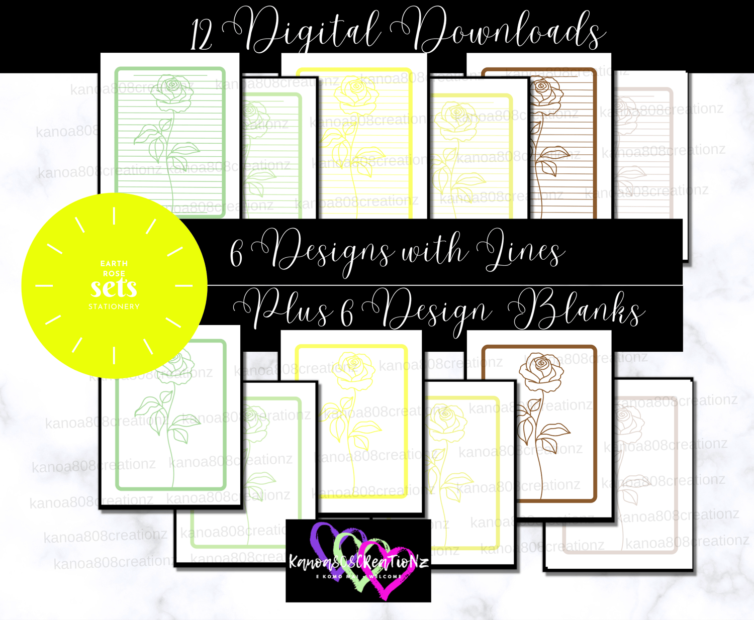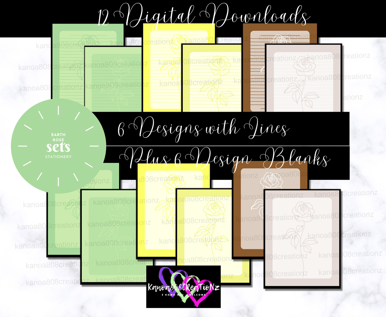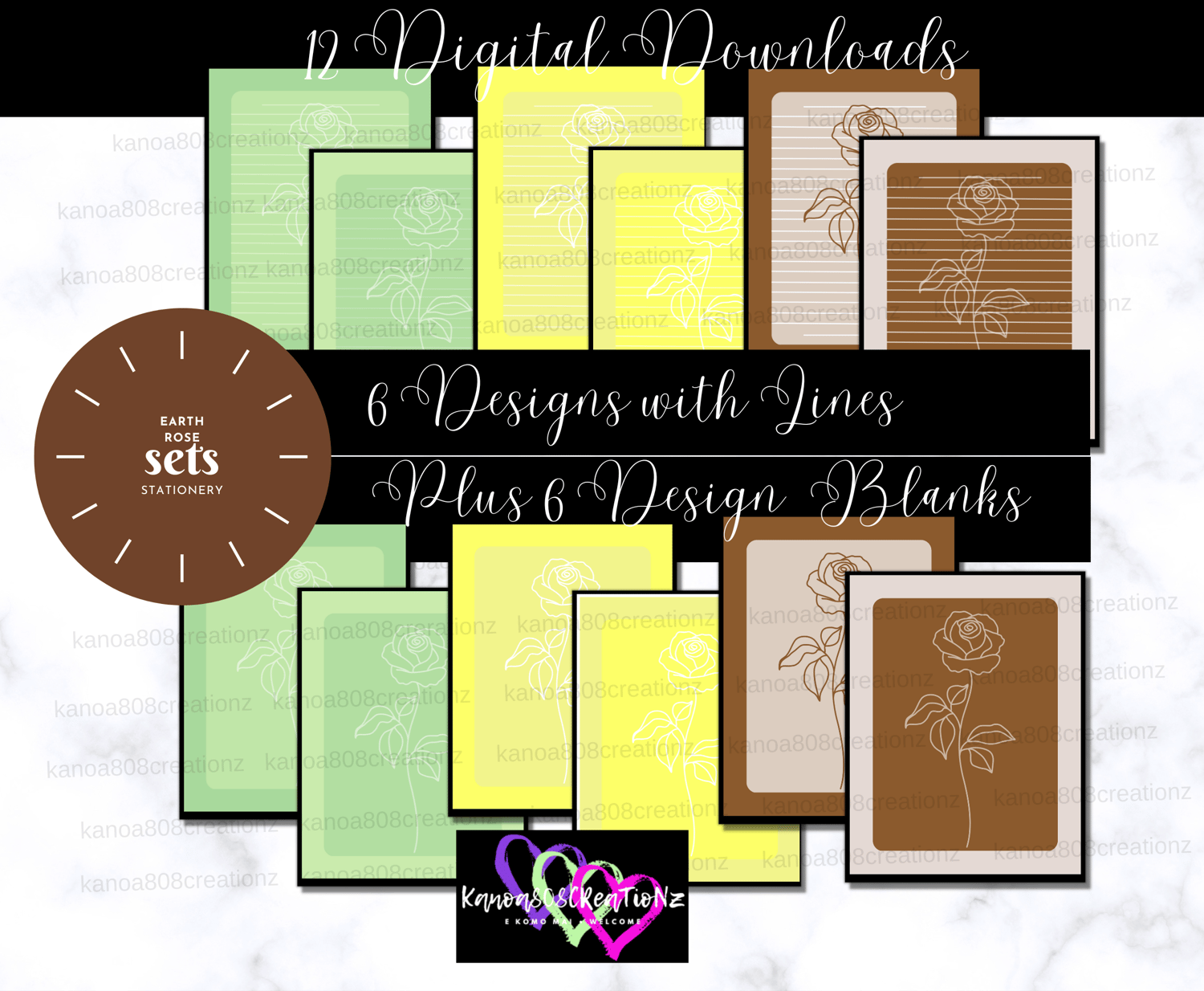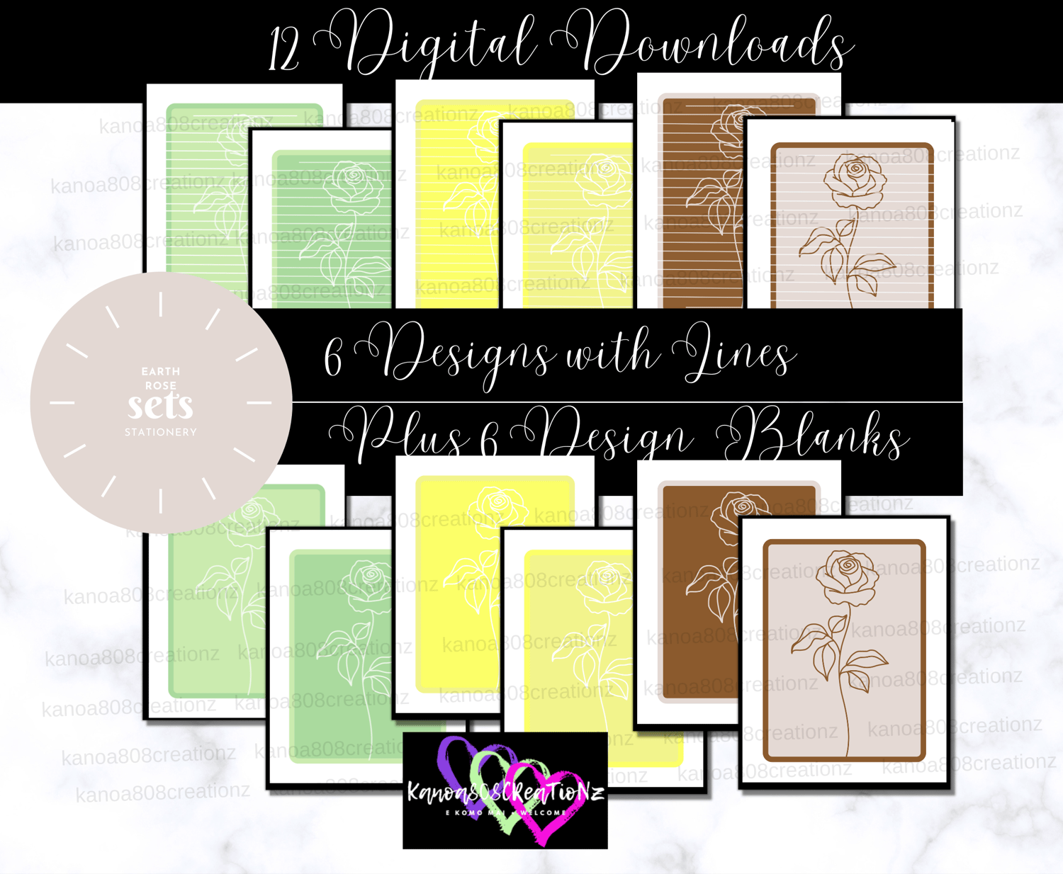 12 Digital Downloadable & Printable Files: Earth Colors Simple Rose Stationery Set