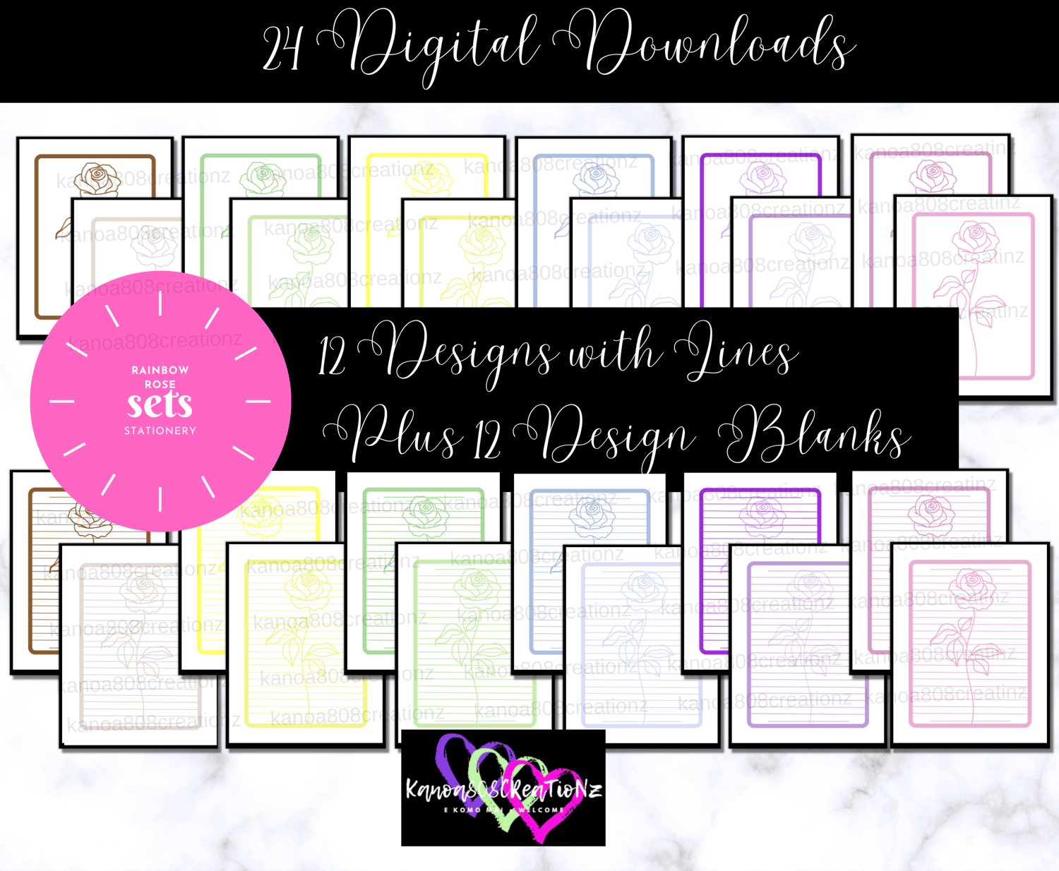 BEST DEAL: 24 Digital Downloadable & Printable Files: Rainbow Colors Simple Rose Stationery Set