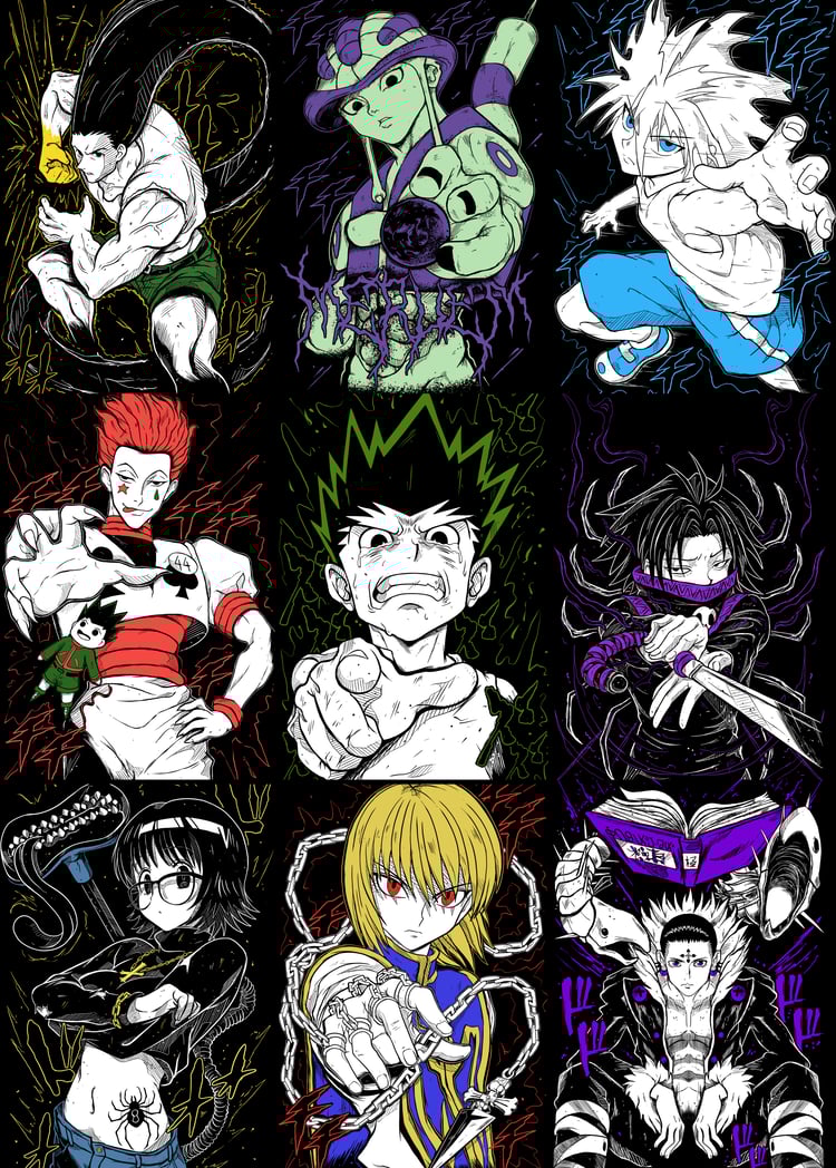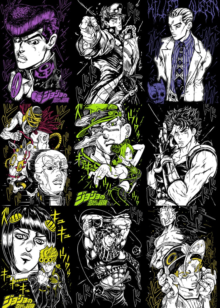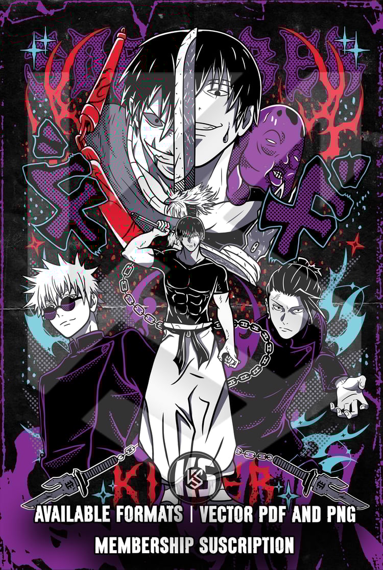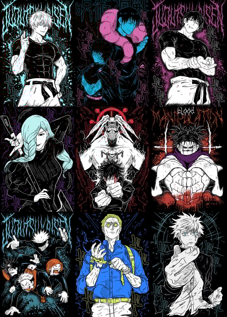 Diseño digital en alta resolución, inspirado en la fuerza, el estilo y la oscuridad de los personajes más icónicos de Jujutsu Kaisen: Yuta, Itadori x Sukuna, Toji, Geto x Kenjaku, Choso, Megumi, Mahito, Maki, Nanami, Gojo, Nobara.