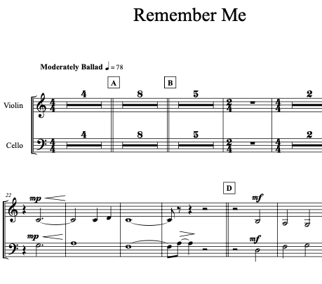 Remember Me - Key of C - Schultz - Cello and Violin Parts