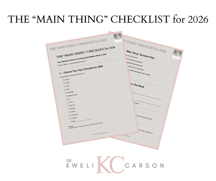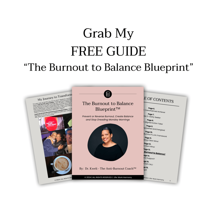 Kweli Carson, also known as Dr. Kweli - The Anti-Burnout Coachᵀᴹ, is an author and coach who helps high-achieving professional women prevent or reverse burnout and create true life-work balance.