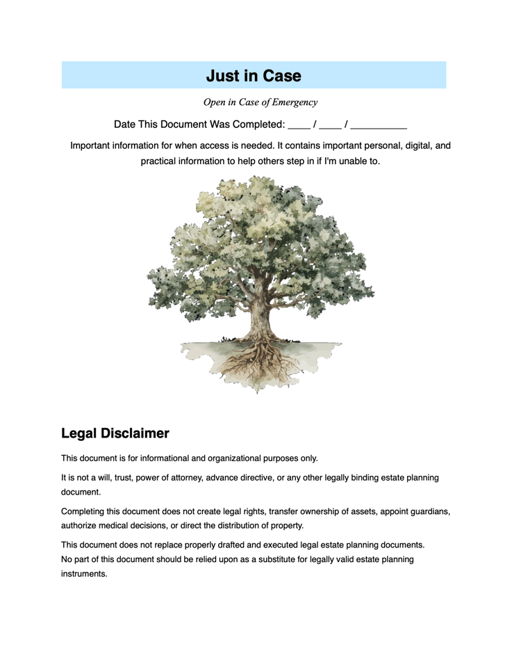 These documents are not legal advice and do not replace a properly drafted estate plan. They are preparation tools meant to help you get organized and move forward with confidence when you are ready to formalize your plan.