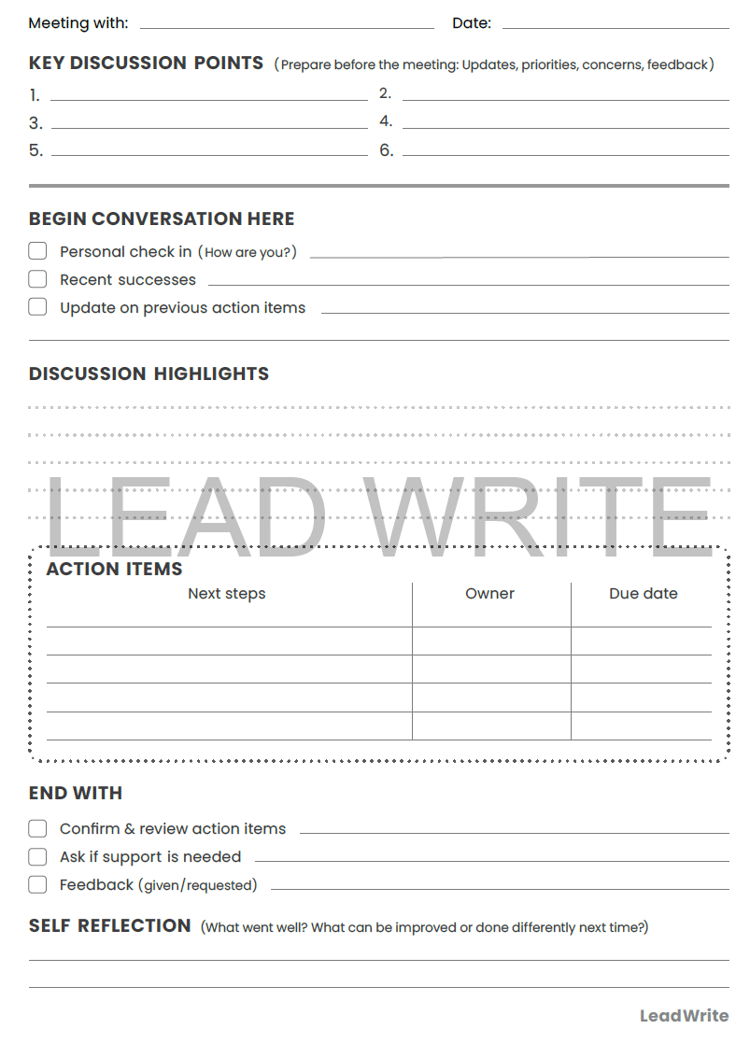 By using this guide, leaders can foster trust, track progress, and empower their teams to achieve their full potential. Whether you're discussing goals, providing feedback, or addressing challenges, this tool ensures that every one-on-one is productive and impactful. Perfect for leaders looking to elevate their team’s performance and build lasting connections.