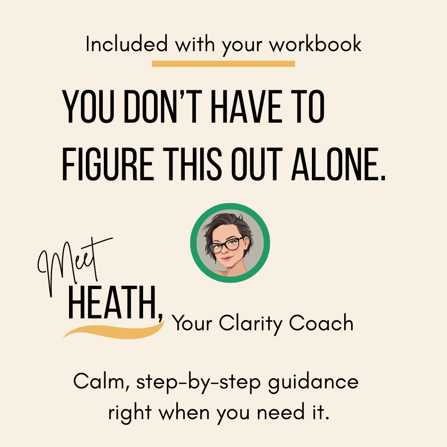 Includes access to Heath, Your Clarity Coach. The all new simple step-by-step AI guide that helps you turn the workbook into real clarity, real decisions, and a business that fits your life, one that you are proud to call your own.