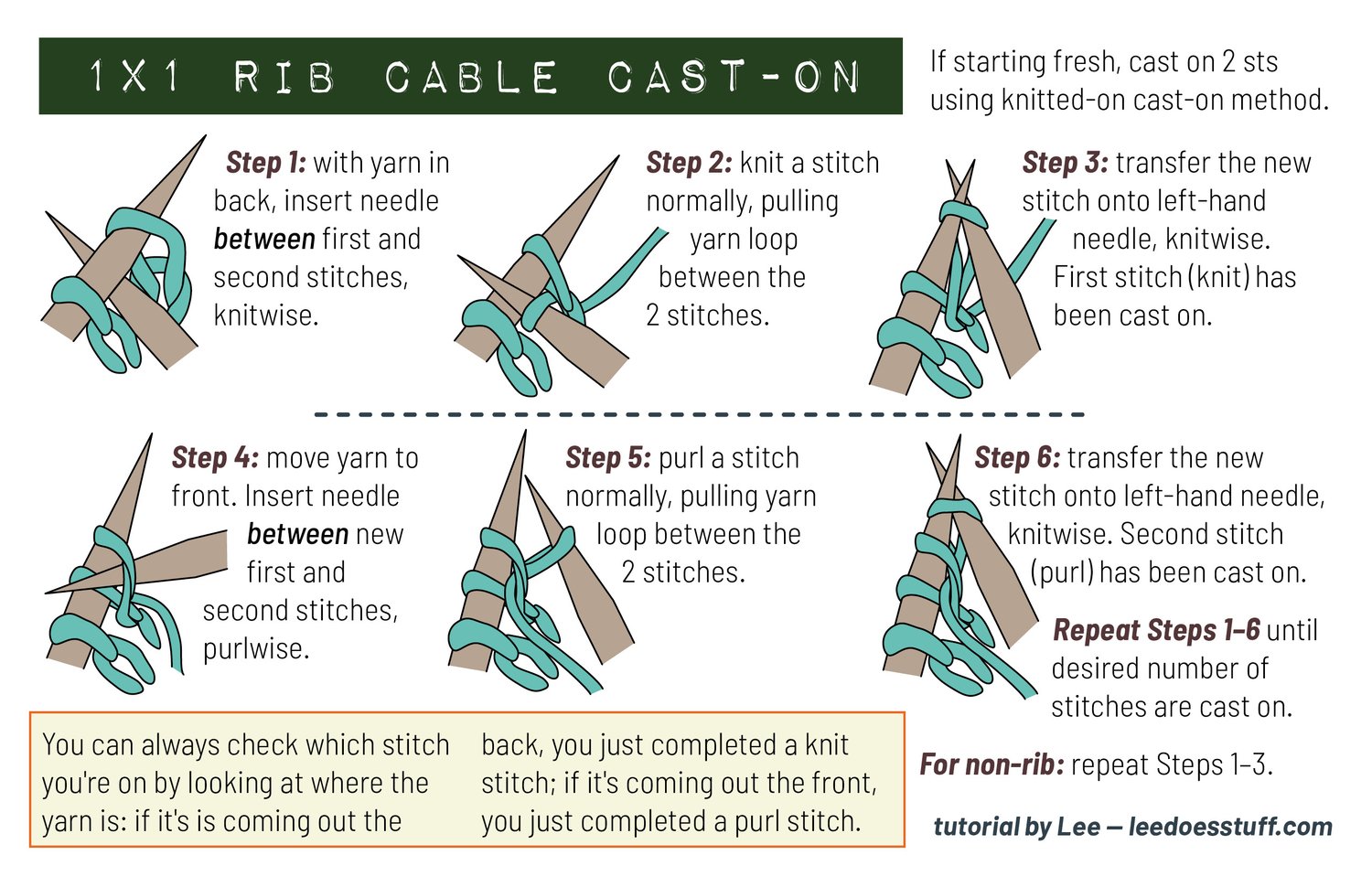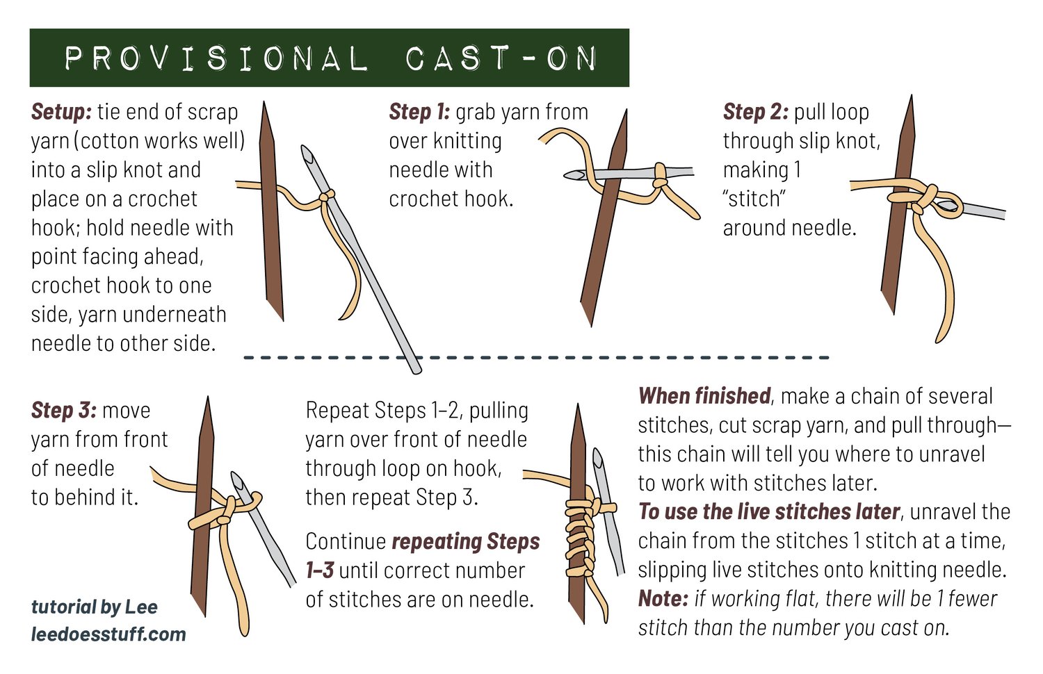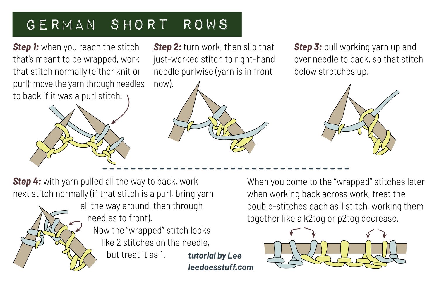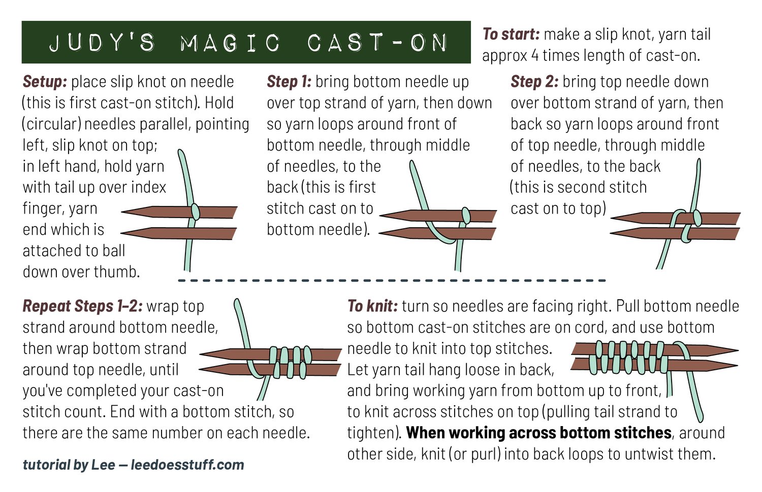 Here are some illustrated diagram tutorials, plus some links to videos or other kinds of tutorials, for various knitting techniques, some newer and some very old. (For old videos, ignore the "leethalknits.com" and other old branding—you are currently on my working knitting website!)