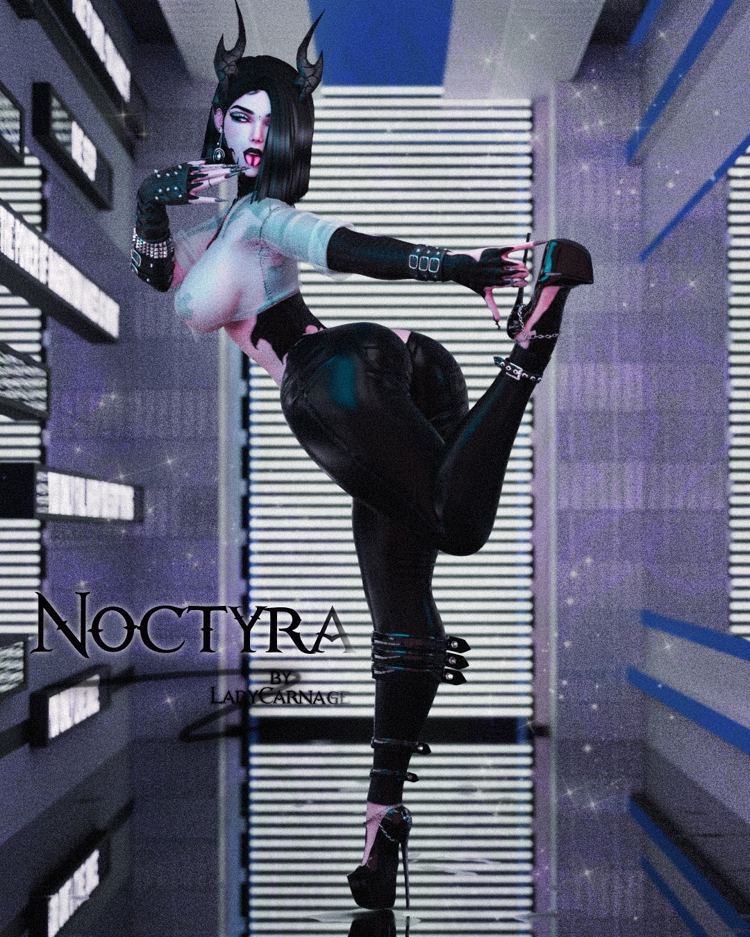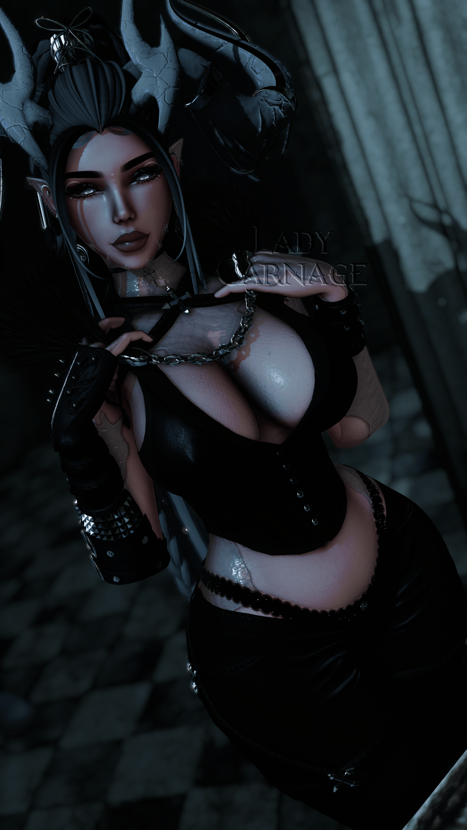Duchess braid/Long ponytail / Horns / Siniestra heels / Body base (heavy edit by me no re use) body is tag / Cinder v2 accessories / Head heavy (edit by me no re use) head is tag / Vampiric chocker / Piercing / Leather Harness / Vampy Choker
