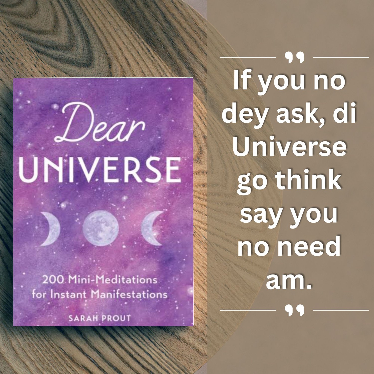 Wahala dey for life? Money no dey? Mind dey race like Okada for Lagos traffic? This year Spiritual Wellness don come with one secret weapon: Sarah Prout “Dear Universe: 200 Mini-Meditations for Instant Manifestations” Dis book na like your personal ...