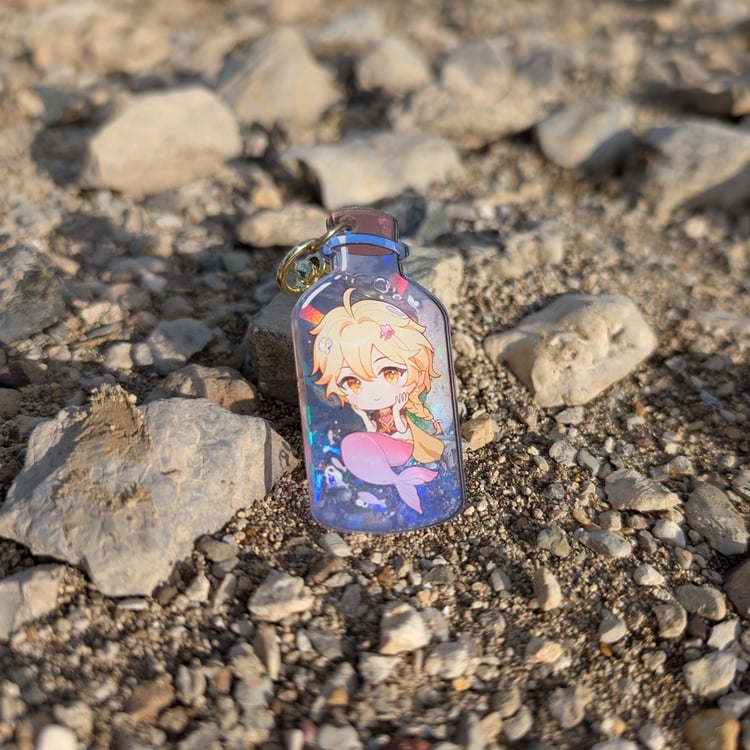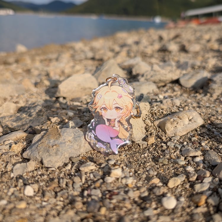 Instead, I turned the rocky beach into a photo shoot plaza for my new acrylic charms and pin, catching the last rays of the setting sun. One of the keychains features a broken-glass effect, and the tiny shrimp-sized Aether looked as if he’d been washed ashore, waiting to be rescued - exactly the scene I was aiming for.