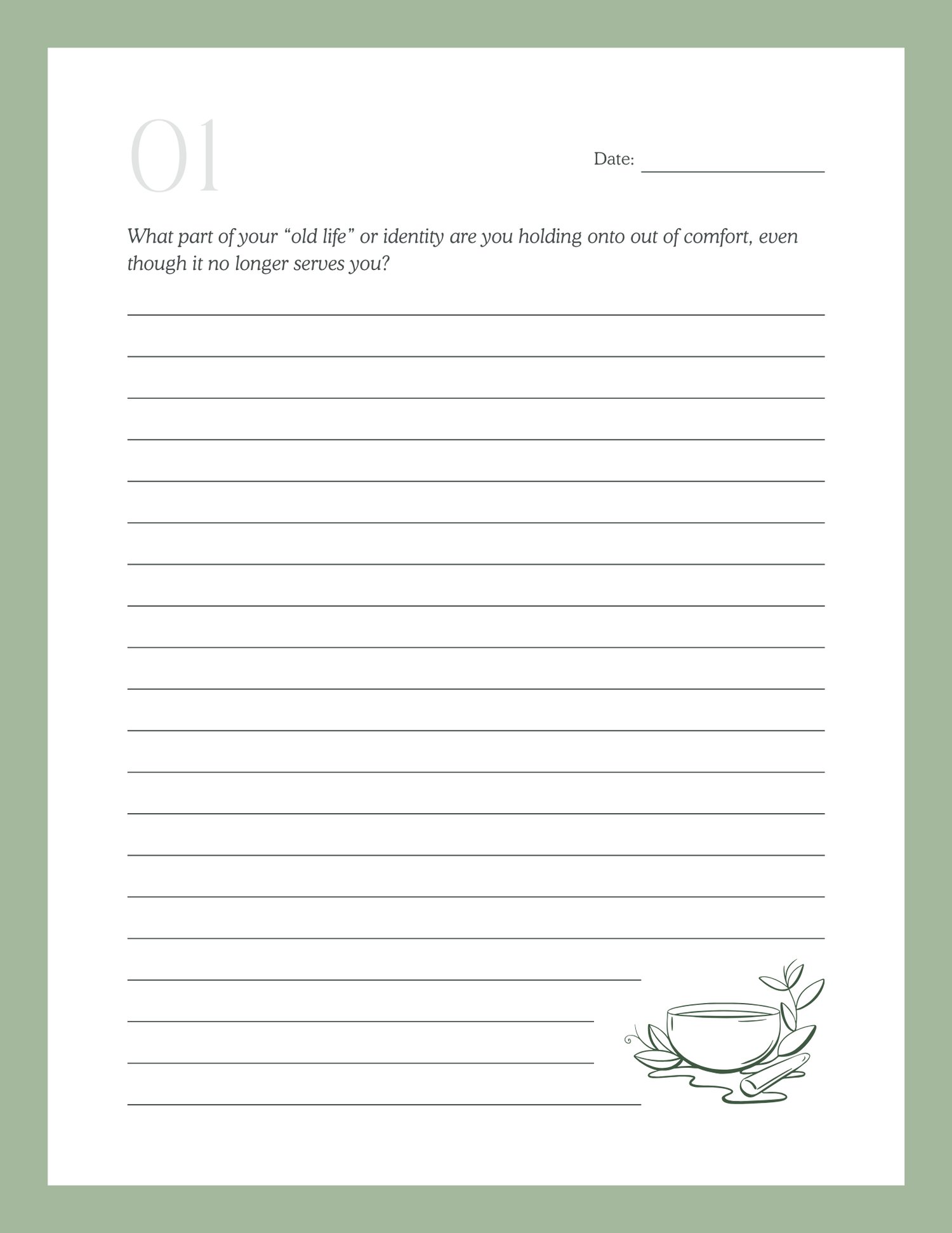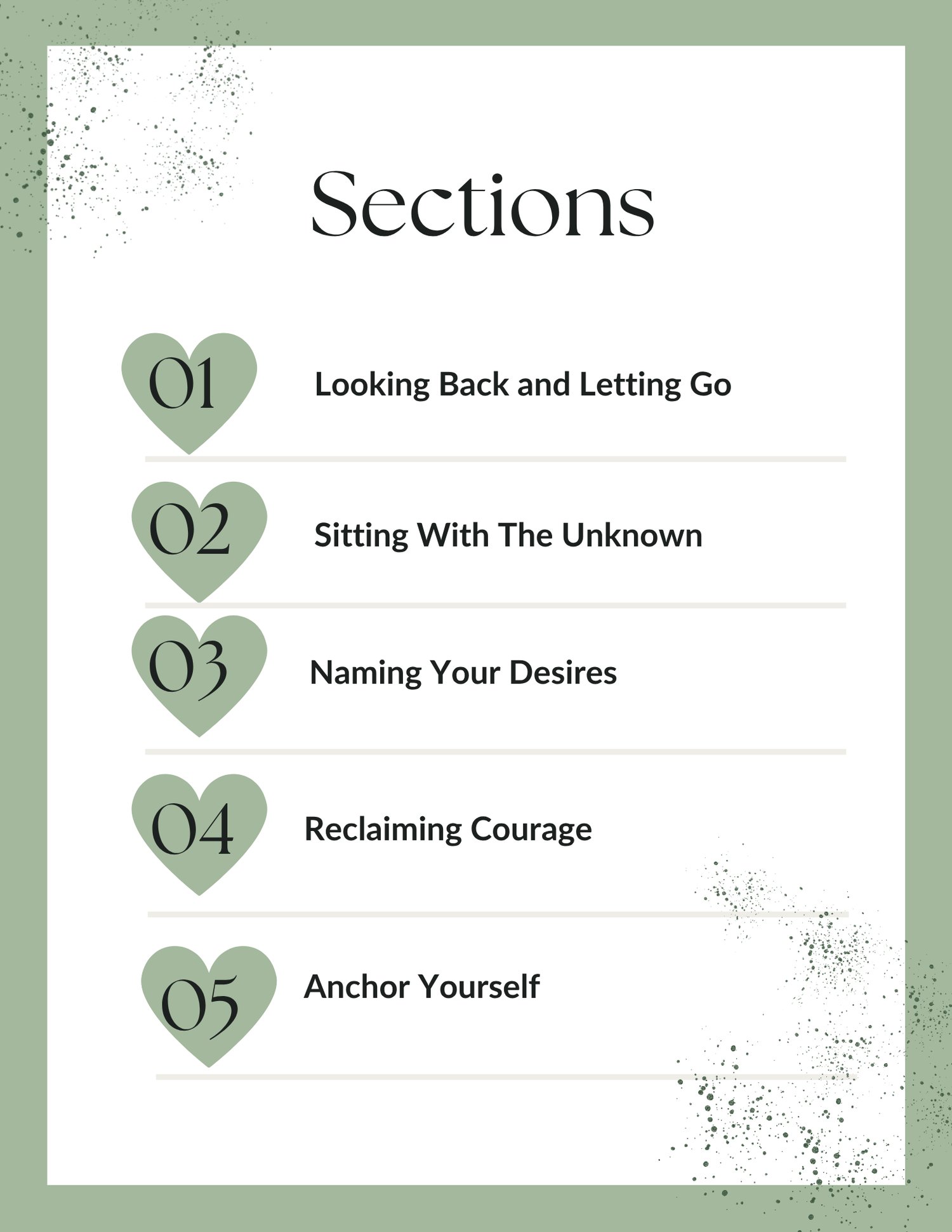 • Looking Back and Letting Go (Section 01): Reflect on what you are holding onto out of comfort and honor the memories or patterns you are releasing.