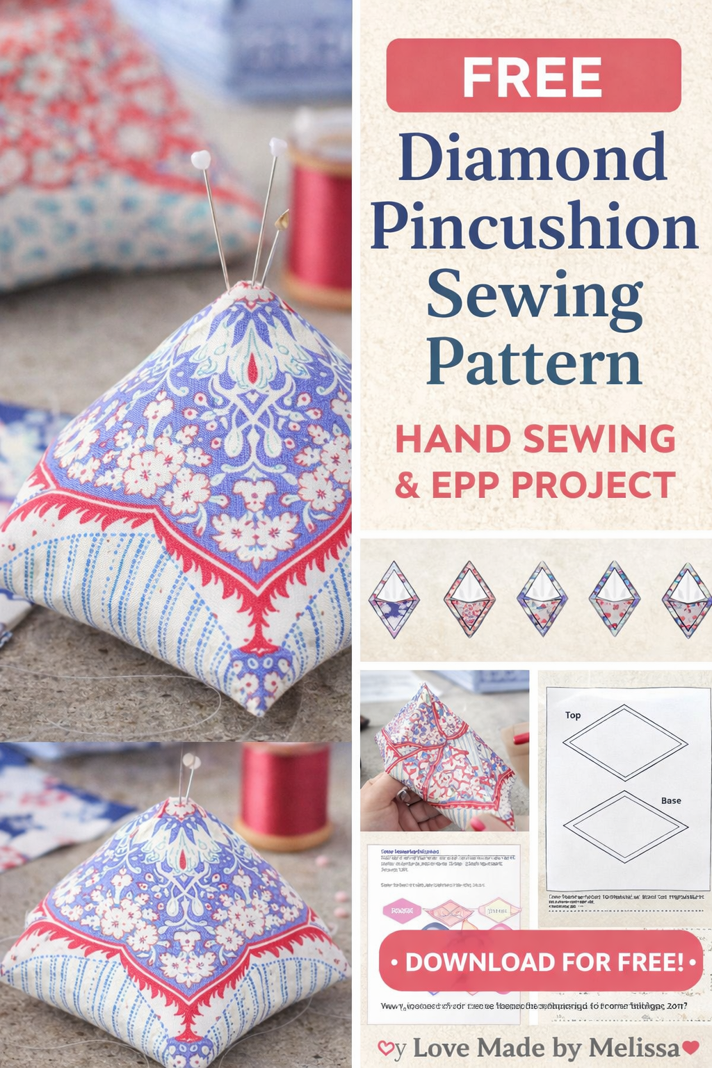 Free Diamond Pincushion Sewing Pattern PDF | Hand Sewing & English Paper Piecing Project