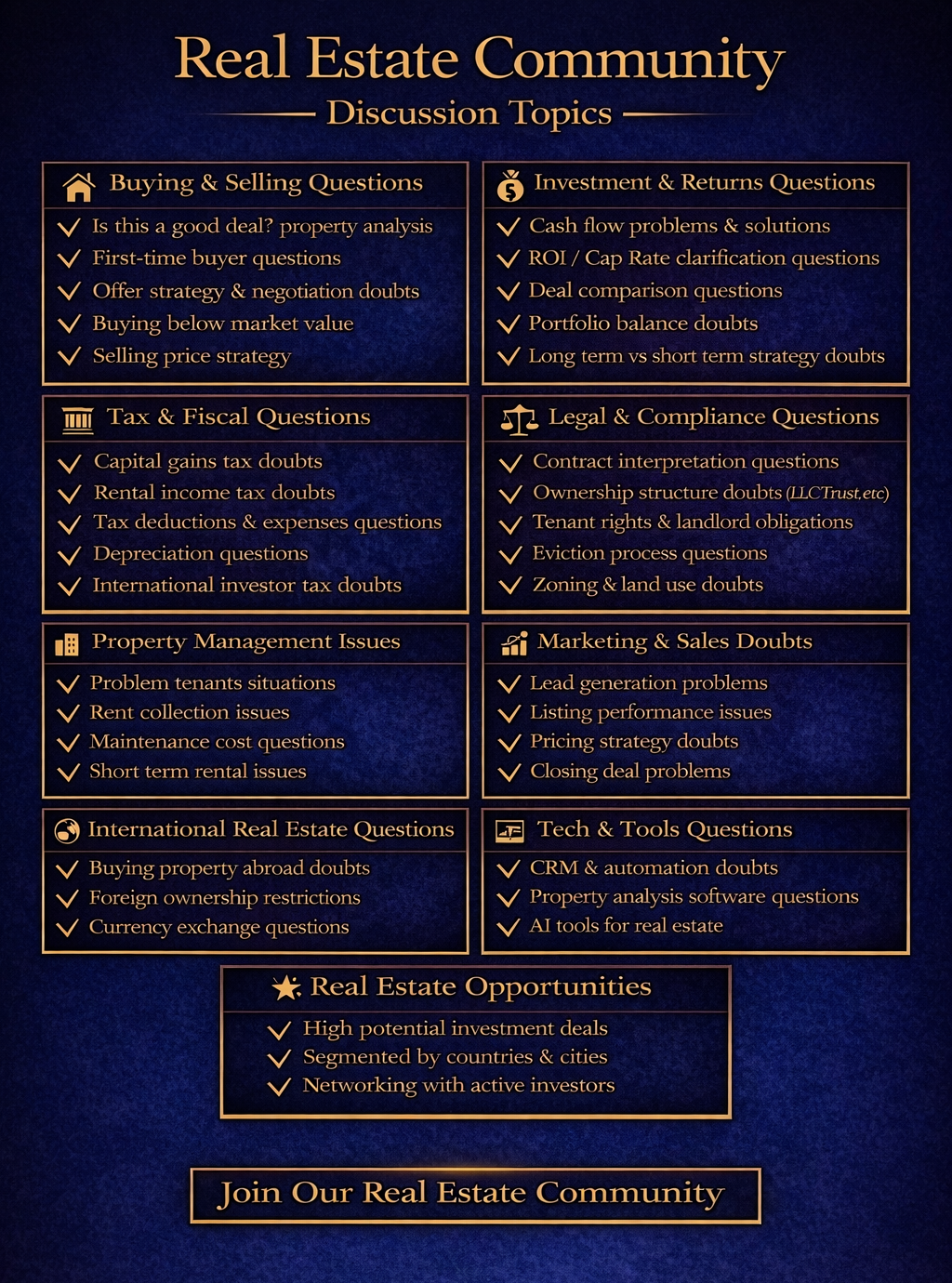The community is designed for real estate investors, agents, and professionals who value informed discussion, strategic insight, and long-term growth.