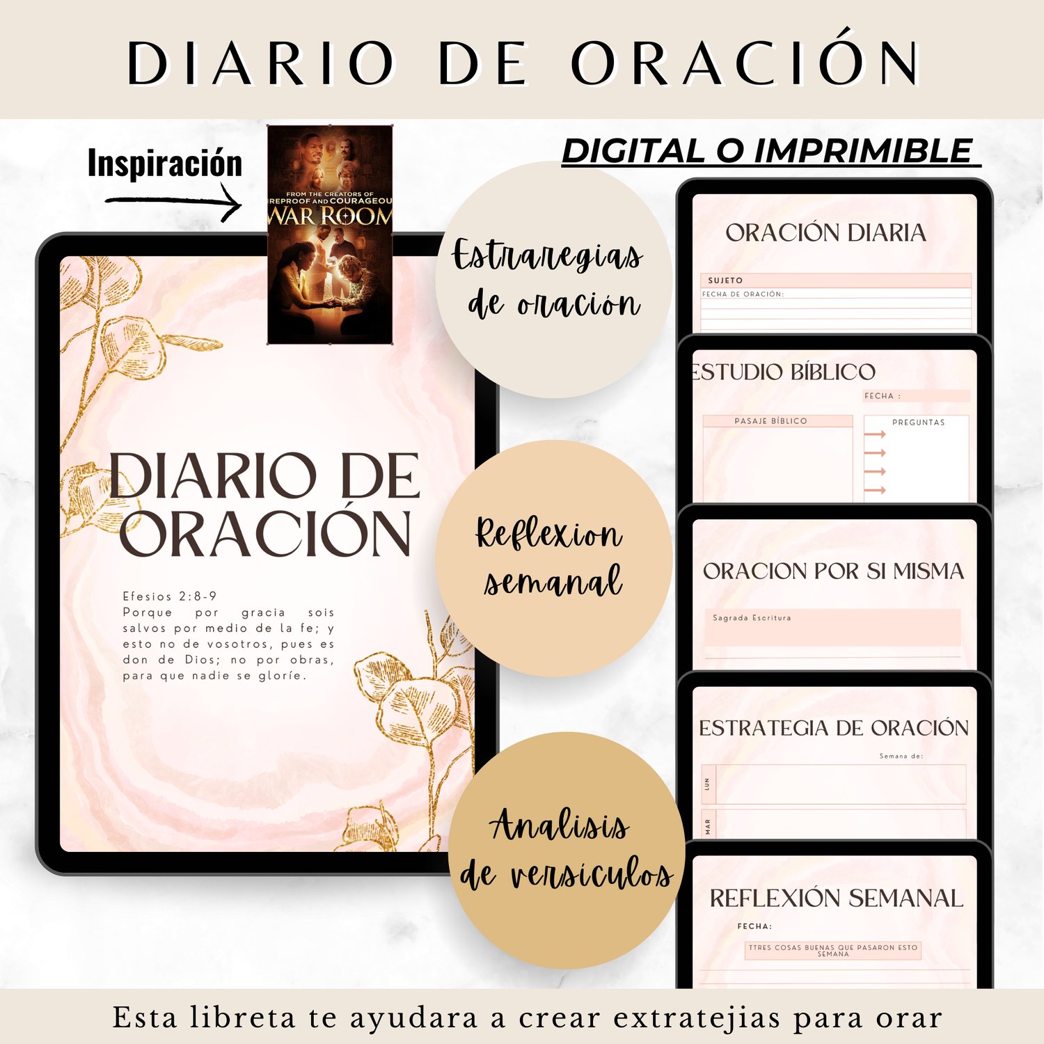 Diario de oración incluye: fue inspirado por la película WAR ROOM (cuarto de guerra) peticiones para si mismo, familiares, amigos, estrategias para orar, peticiones contestadas, puntos de oración, notas del sermón, análisis de versículos, estudio biblico y mas.