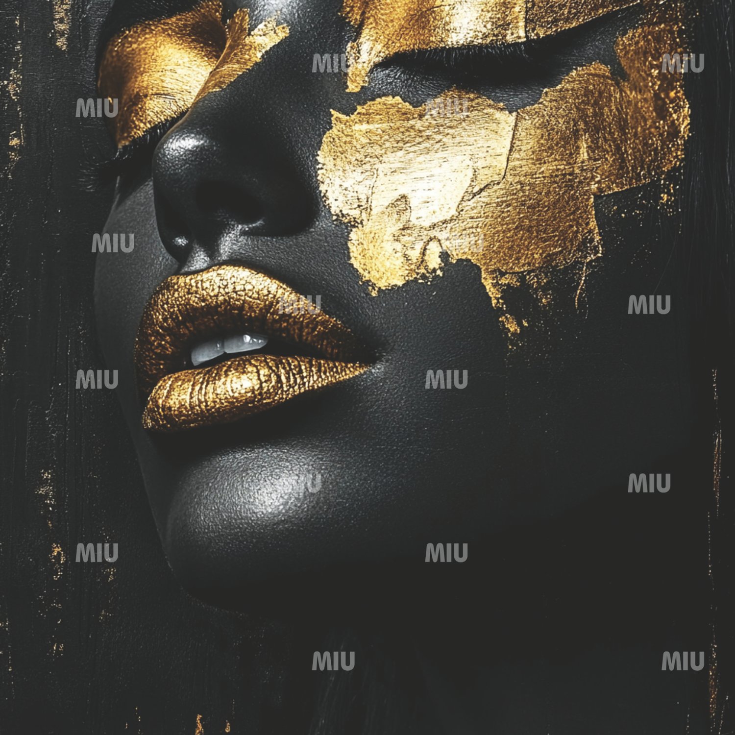 Œuvre d’art digital Gold Collection – Souveraine D’Or, représentant un visage féminin noir intense orné de feuilles d’or sur les yeux et les lèvres, ambiance puissante, élégante et contemporaine.