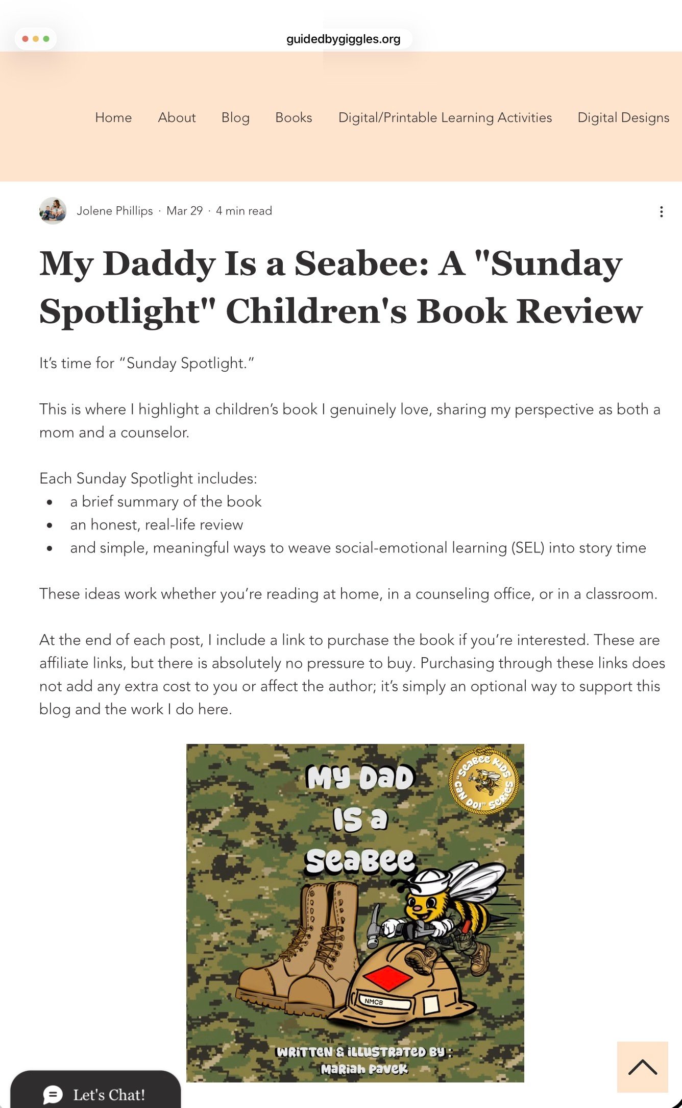 I started creating My Dad is a Seabee during my husband’s deployment with NMCB 1. After reading multiple books about military families, my kids were frustrated—they couldn’t connect with any of them. None of the sailors looked like their dad. One of my kids even said, “My dad doesn’t go on a ship… and their boots aren’t even the right color.”