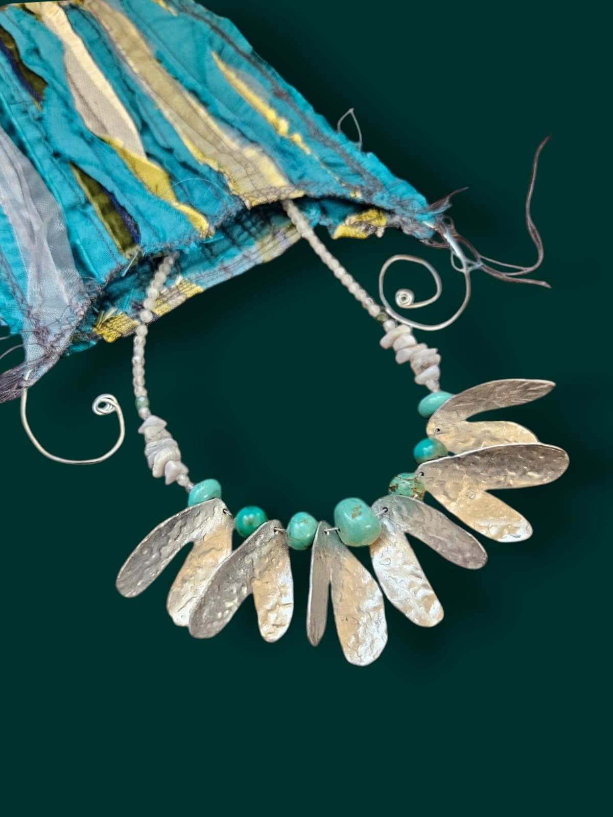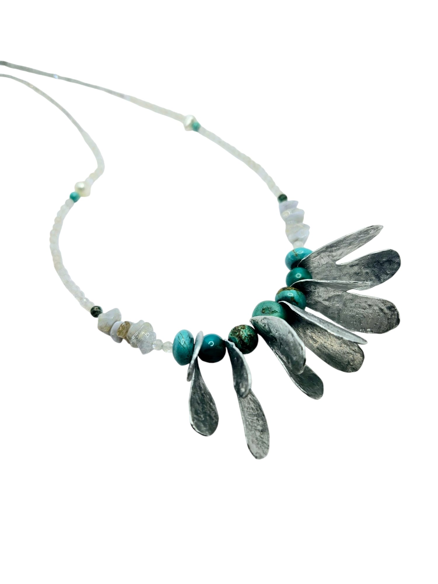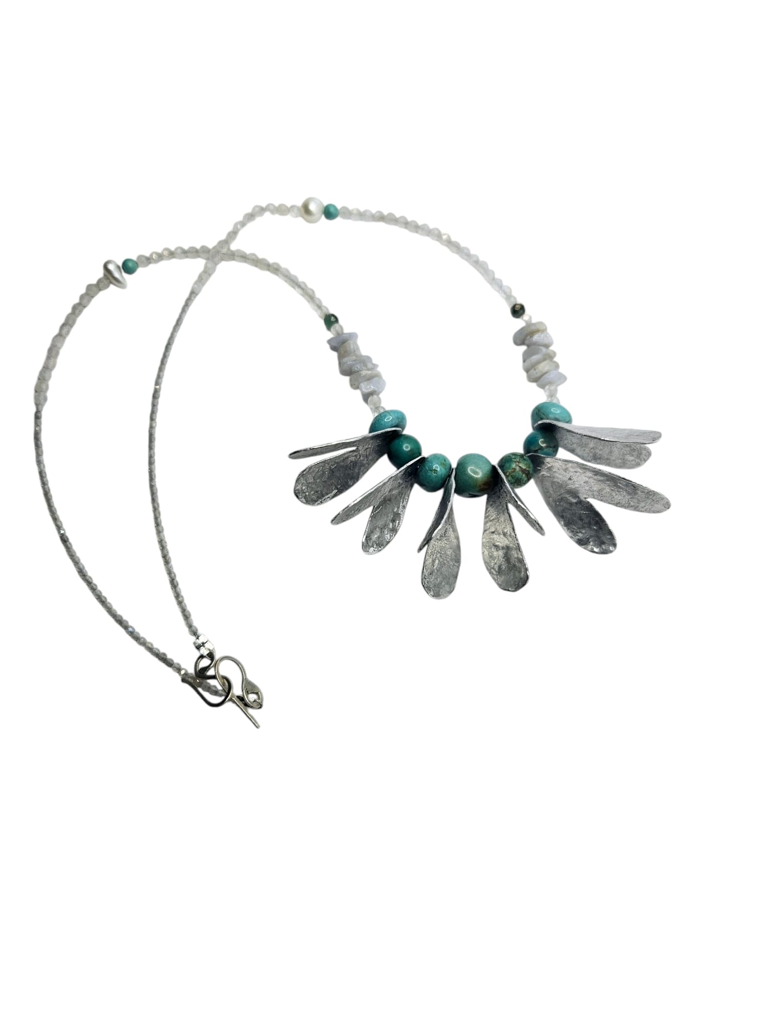 This is silver and gemstone sea kelp statement necklace. 22 inch in length featuring sterling silver hand cut hammered kelp forms, chunky cut turquoise beads and finished delicate faceted moonstone beads.