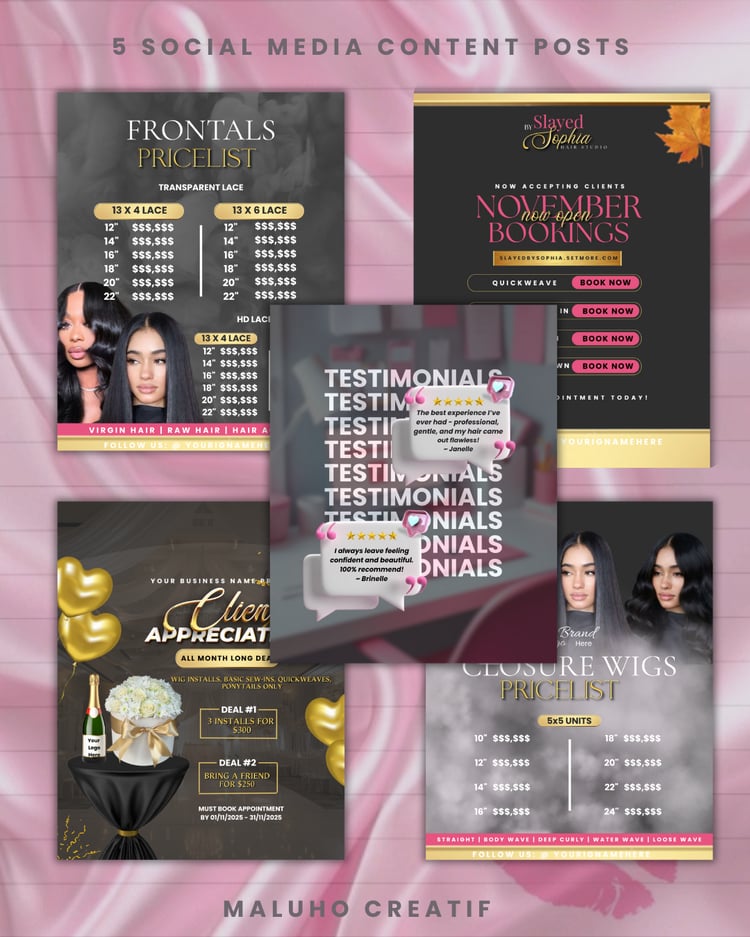 At Maluho Créatif, we create ready-to-use branding tools for beauty professionals - from flyers and templates to certificates and full branding assets. Our designs are professional, aesthetic, and easy to customize, helping lash techs, MUAs, and hairstylists elevate their brand and impress clients instantly.