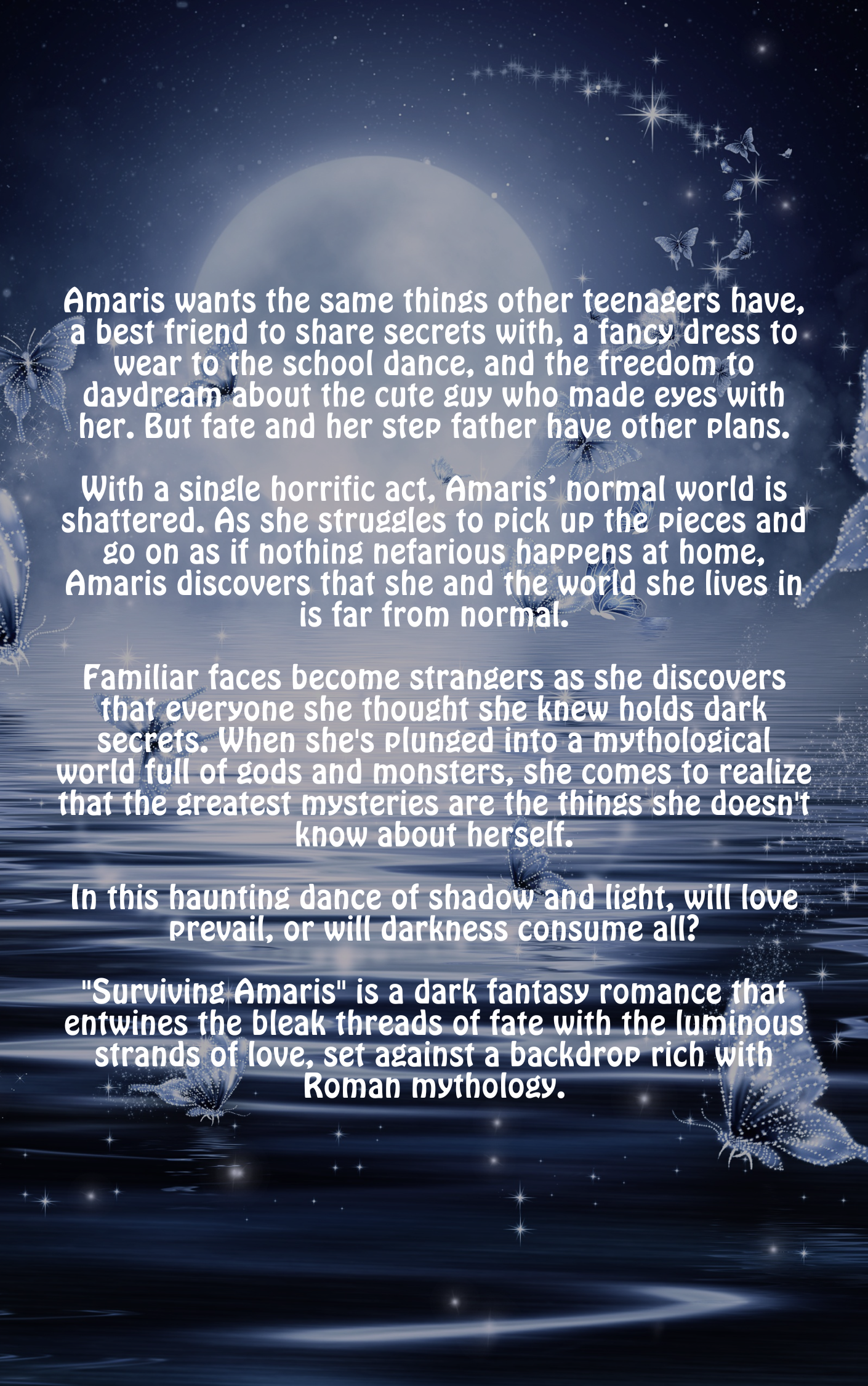 “No. No. No.” I scream and without thinking sit straight up. Adrenaline pumps through my veins, and I reach for my side, bracing myself to expect the worst. My hands brush against something soft, and I throw it off of me. The color of a white sheet catches my foggy, unfocused eyes, and my lungs take a long, deep breath. I peruse my surroundings. I’m safe, in bed, and in my massive room.