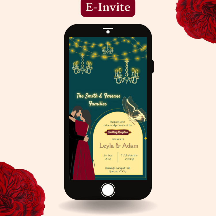 R1 Red Dress & Chandeliers Wedding Reception Invitation