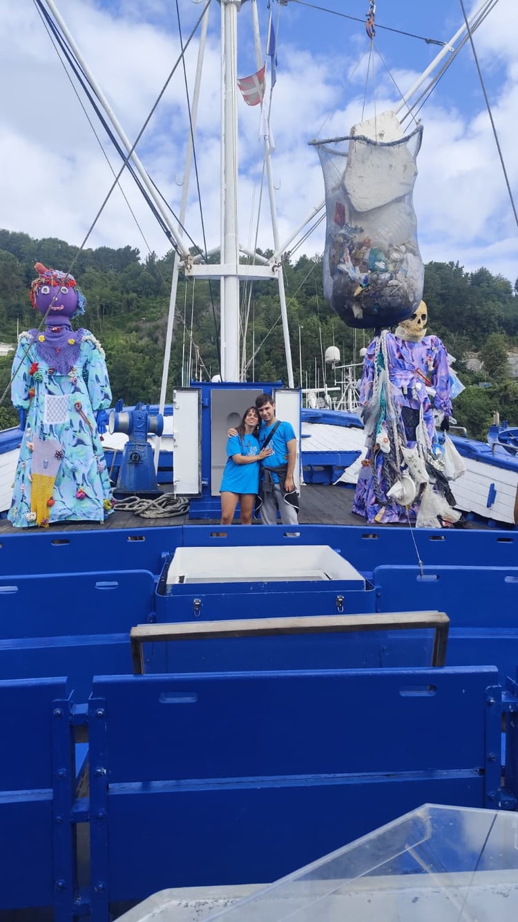 Aquí estoy con Daniel en el barco donde dormíamos en el Hondarribia (País Vasco), divulgando sobre el uso de los plásticos y concienciando a la gente :)
