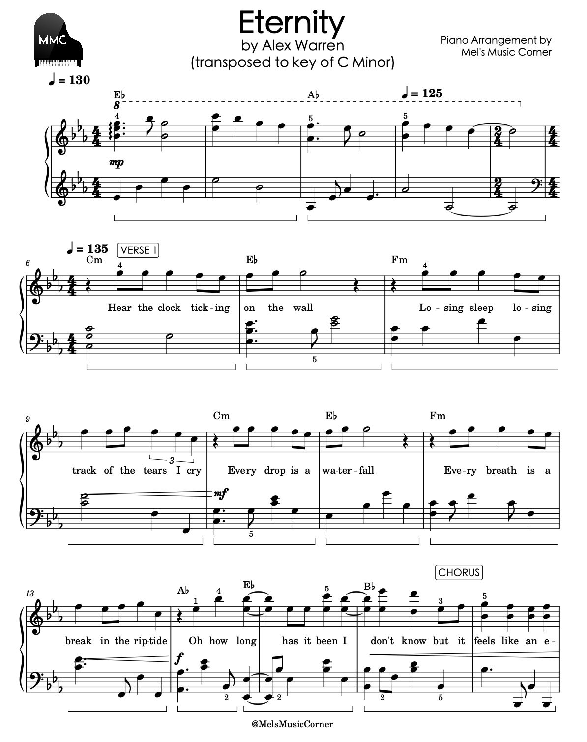 Eternity by Alex Warren piano sheet music - transposed to Key of C minor