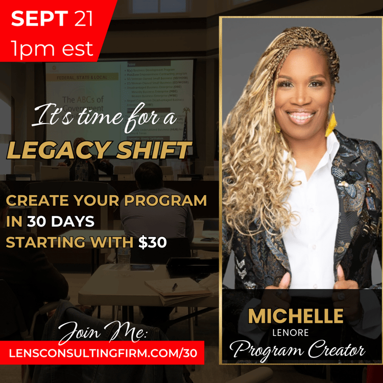 Michelle Lenore is the CEO of Michelle Lenore Enterprises & LENS Consulting Firm. She assists large organizations to become the preferred company for growth and innovation by helping small businesses become government-certified and win multi-year, public & corporate multi-million-dollar contracts – all by leveraging the same products or services already on the market for sustainable growth.