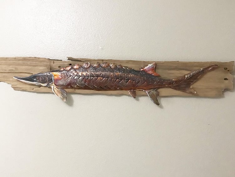 The sturgeon is such a unique and prehistoric looking fish. The backboard was salvaged from a lake in Northern Wisconsin, and truly a great find!!