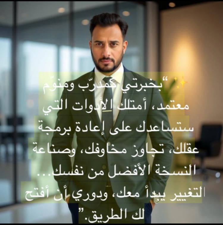 أخصائي محترف في التنويم الإيحائي، مدرّب حياة، مستشار أسري ونفسي، ومدرّب دولي معتمد. أكرّس جهودي لمساعدة الأفراد على تحقيق التوازن النفسي والنمو الشخصي وتطوير الذات.