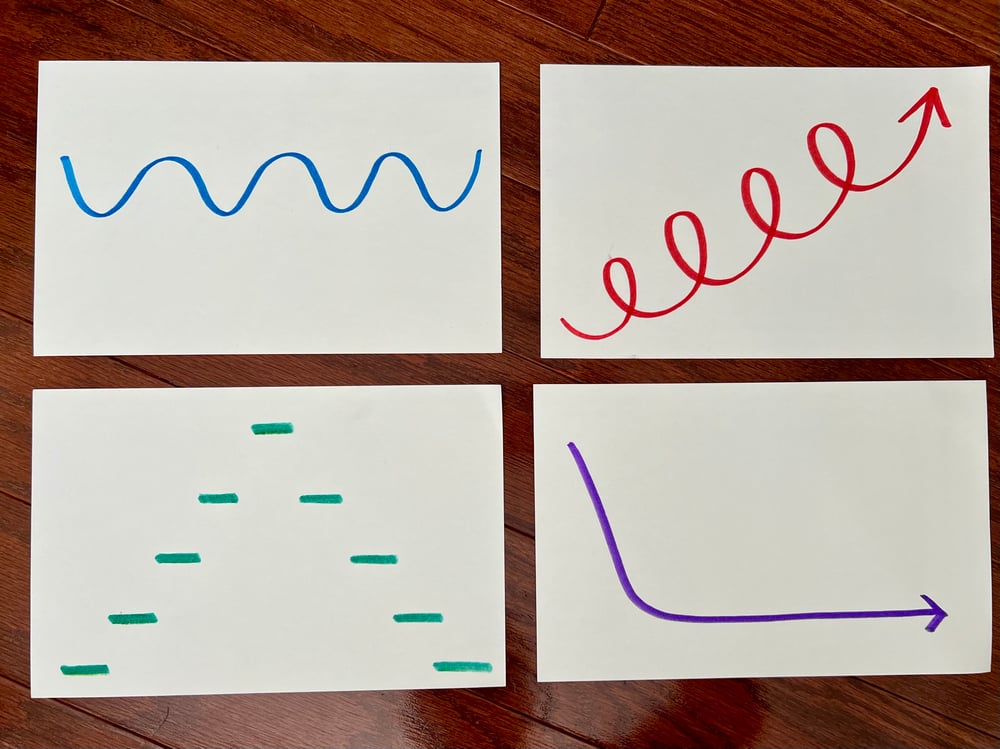 The parent/teacher should model how to make the sounds on each card first. Choose a neutral syllable to sing, "ooooh" or "doooo" works well. You will model for the kids how to make your voice go up or down, and whether the sounds should be smooth and connected, versus separated.