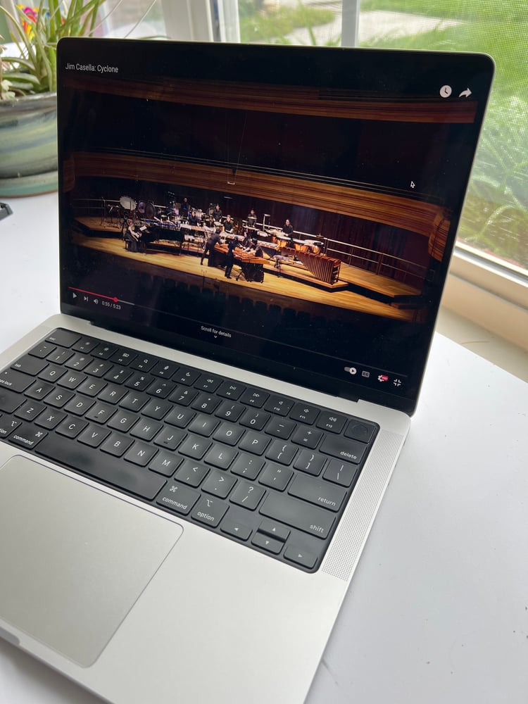 Readers may notice a few unusual things in the story: the section of percussion instruments is located at the front of the stage (in typical setups it would be near the very back), and the percussionist is only wearing socks on her feet! Oh, and also the teacher brought along a large bag of balloons. Hmmmm...I wonder what's going on...