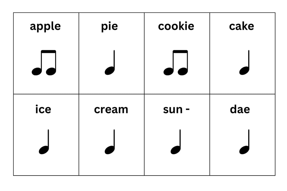 Here's where you start to teach the process of counting rhythm sounds - similar to syllables. At this age, you want kids to start differentiating between one rhythm sound (quarter note) and two rhythm sounds (paired eighth notes). As you help them clap each word, draw in the correct rhythm symbol that matches. When it's all completed it will look like this: